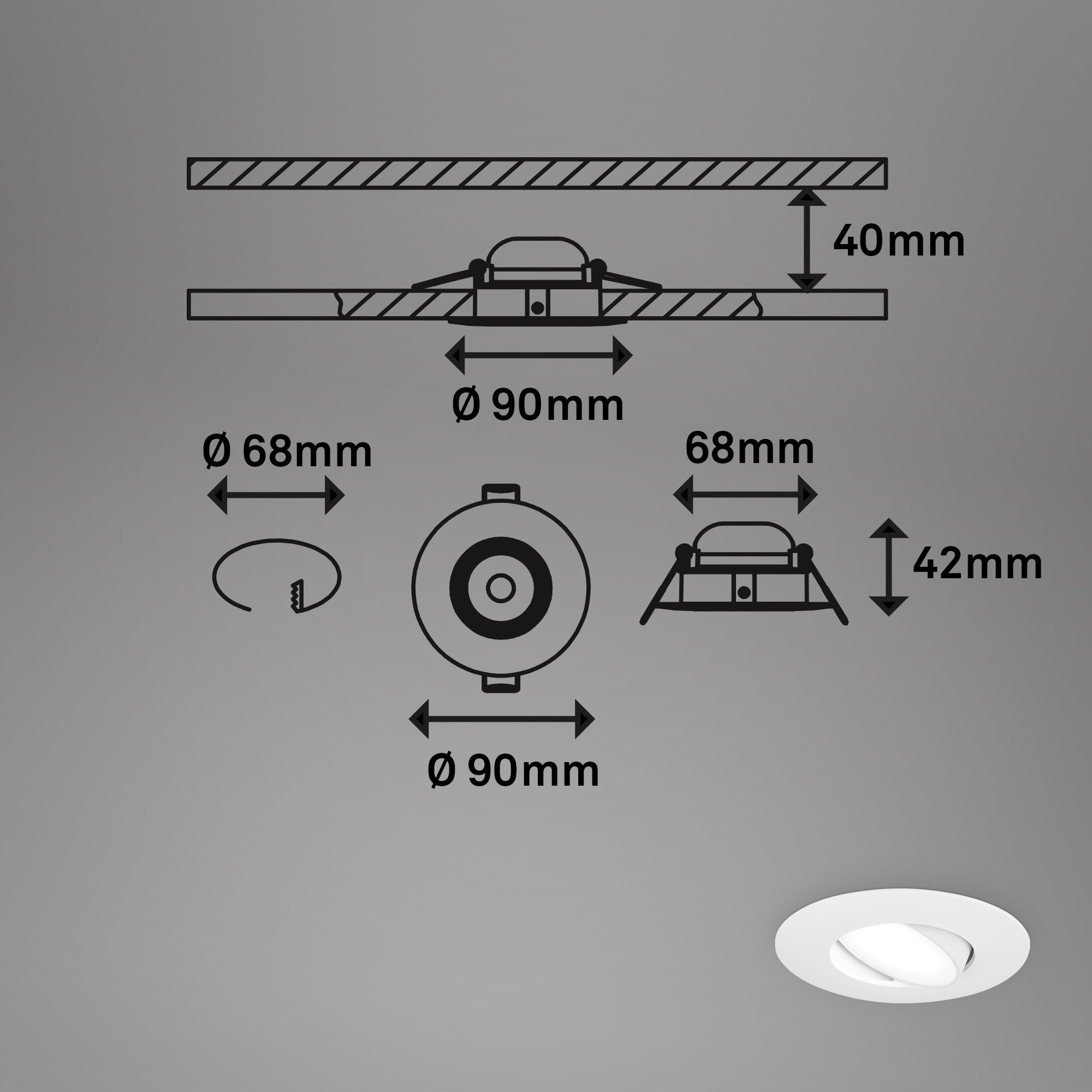 - Montážní otvor: 68 mm (průměr), zápustná hloubka 50 mm