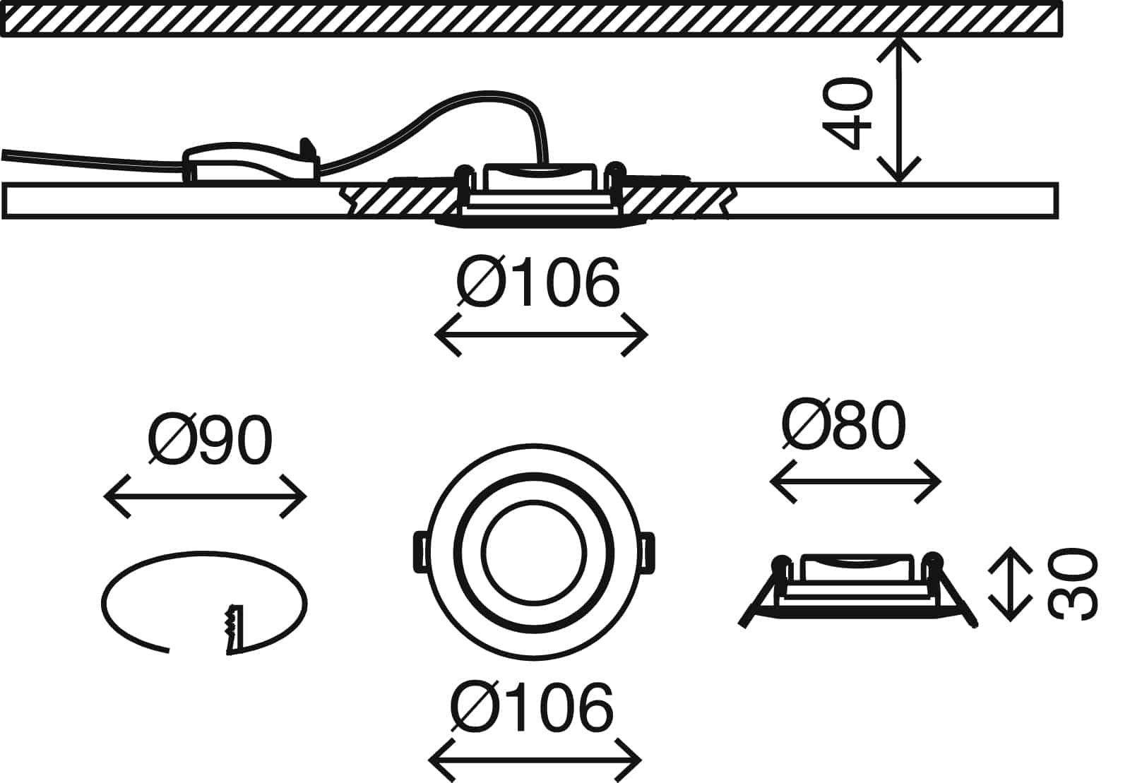 Montáž zvládnete jednoduše díky přesně zpracovaným rozměrům pro vestavbu (otvor 90 mm, hloubka 40 mm). LED technologie minimalizuje potřebu údržby, svítidla jsou odolná vůči běžnému provozu a díky dlouhé životnosti zapomenete na složité výměny žárovek.