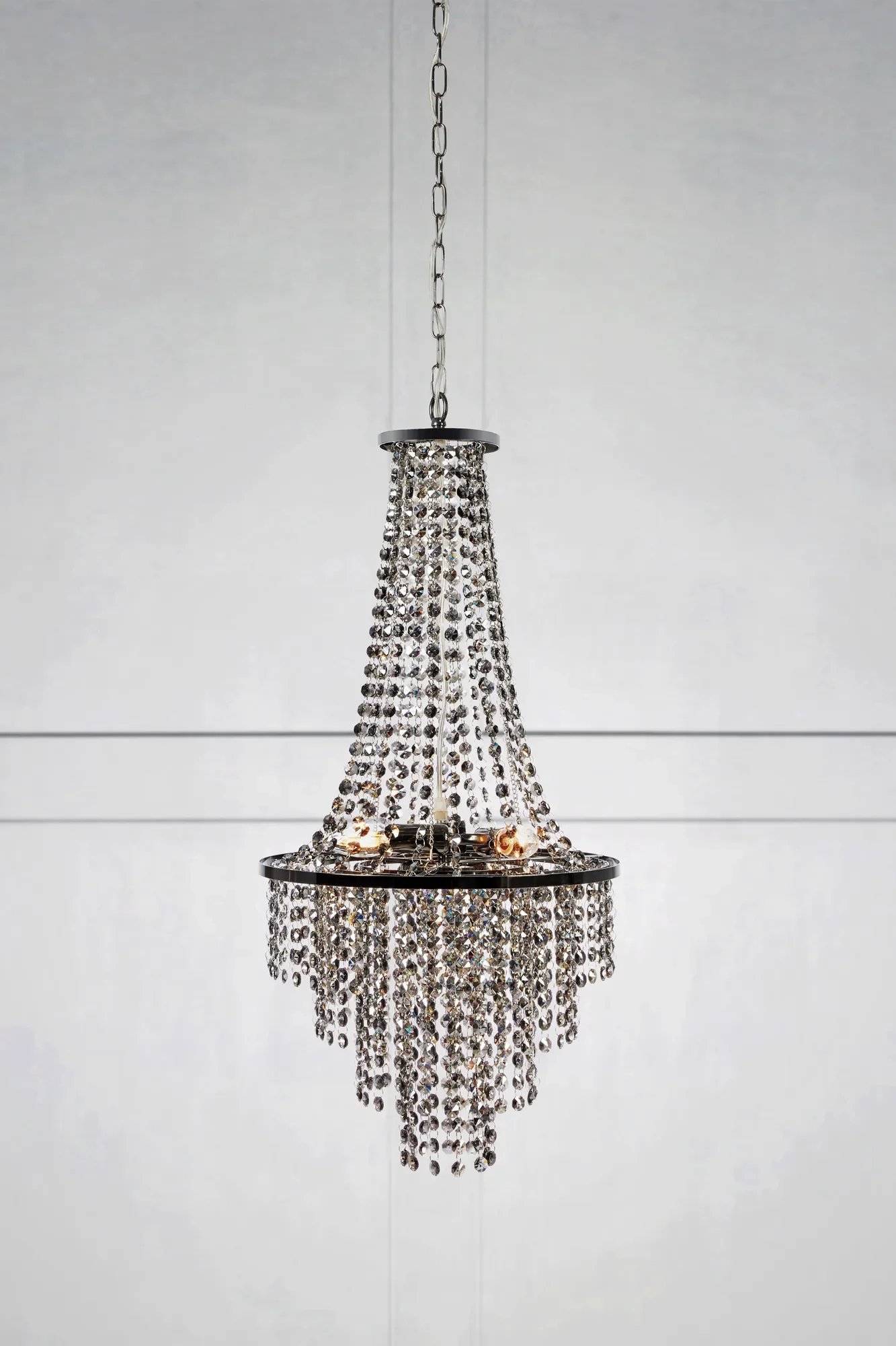 Díky kombinaci tmavého kovu a kouřového krystalu lustr skvěle zapadne do moderních i tradičních interiérů, kde vynikne zejména nad jídelním stolem, v obývacím pokoji či vstupní hale. Doporučujeme použít kvalitní LED žárovky s teplotou chromatičnosti kolem 2700–3000K pro příjemné, teplé světlo, které podpoří atmosféru luxusu a pohodlí. Pro maximální efekt doporučujeme ladit s dalšími dekoracemi v kovových či skleněných tónech.