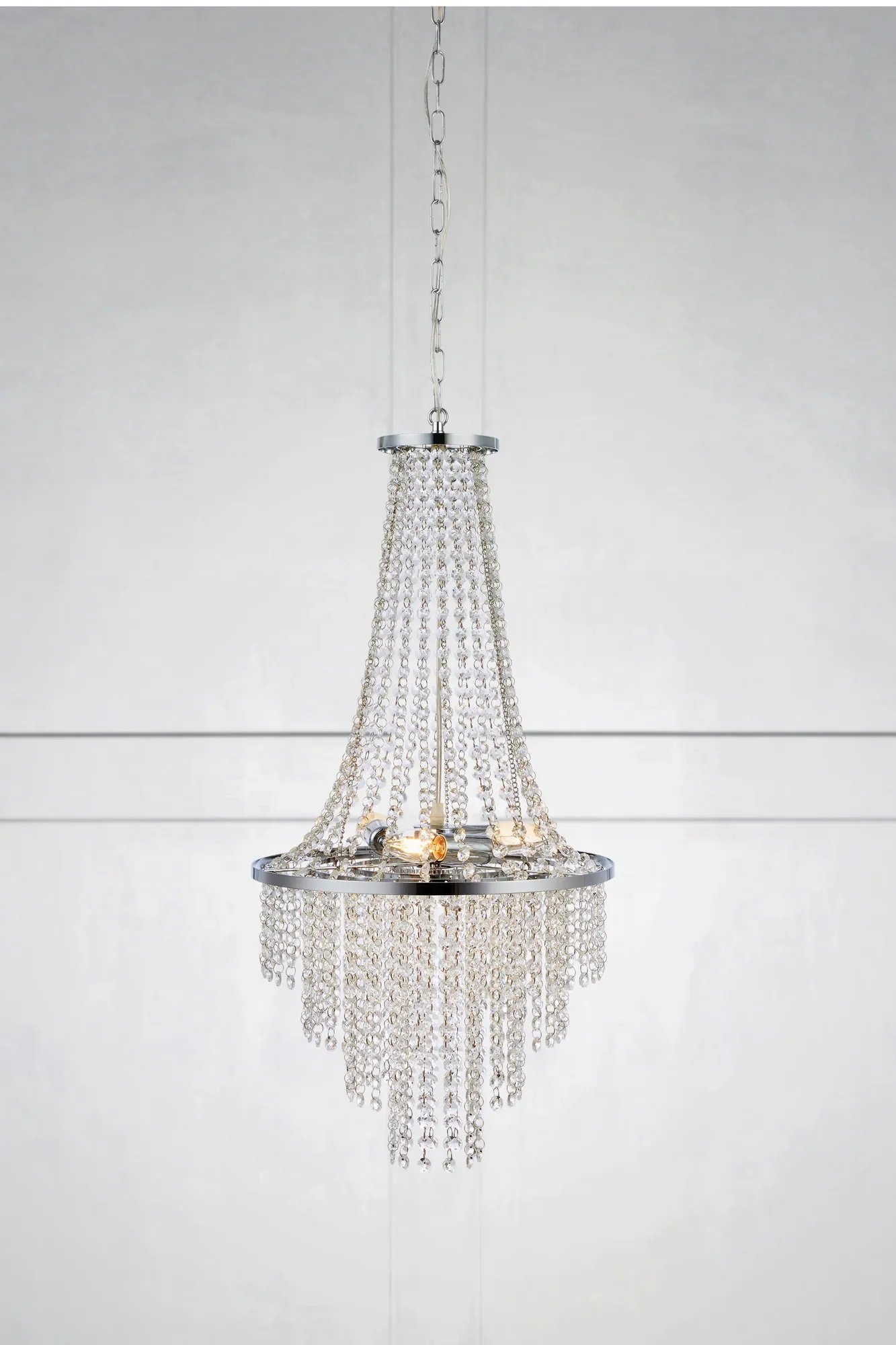 Lustr je tvořen robustním rámem z kvalitního železa v chromové úpravě. Závěsné čiré křišťálové hranoly jsou vrstveny v několika úrovních, což zajišťuje maximální průchod a lom světla. Design je inspirován tradičními lustry, ale díky čistým liniím a chromovanému lesku působí současně velmi moderně.