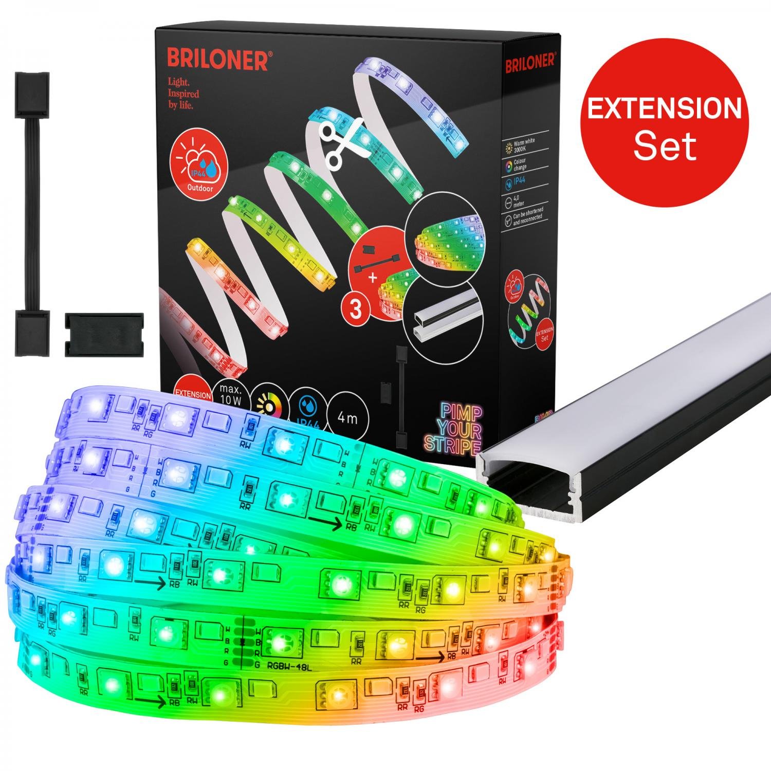 Prodlužovací sada BRILONER Pimp Your Stripe je ideálním řešením pro ty, kteří chtějí rozšířit svůj stávající LED pásek na ještě větší délku a maximalizovat světelný efekt na svých terasách, zahradách, balkonech nebo v interiéru. Tato 4metrová sada je určena jako doplněk ke kompatibilním startovacím sadám a přináší široké možnosti personalizace světelné atmosféry díky kombinaci RGB barev a teplého bílého světla.