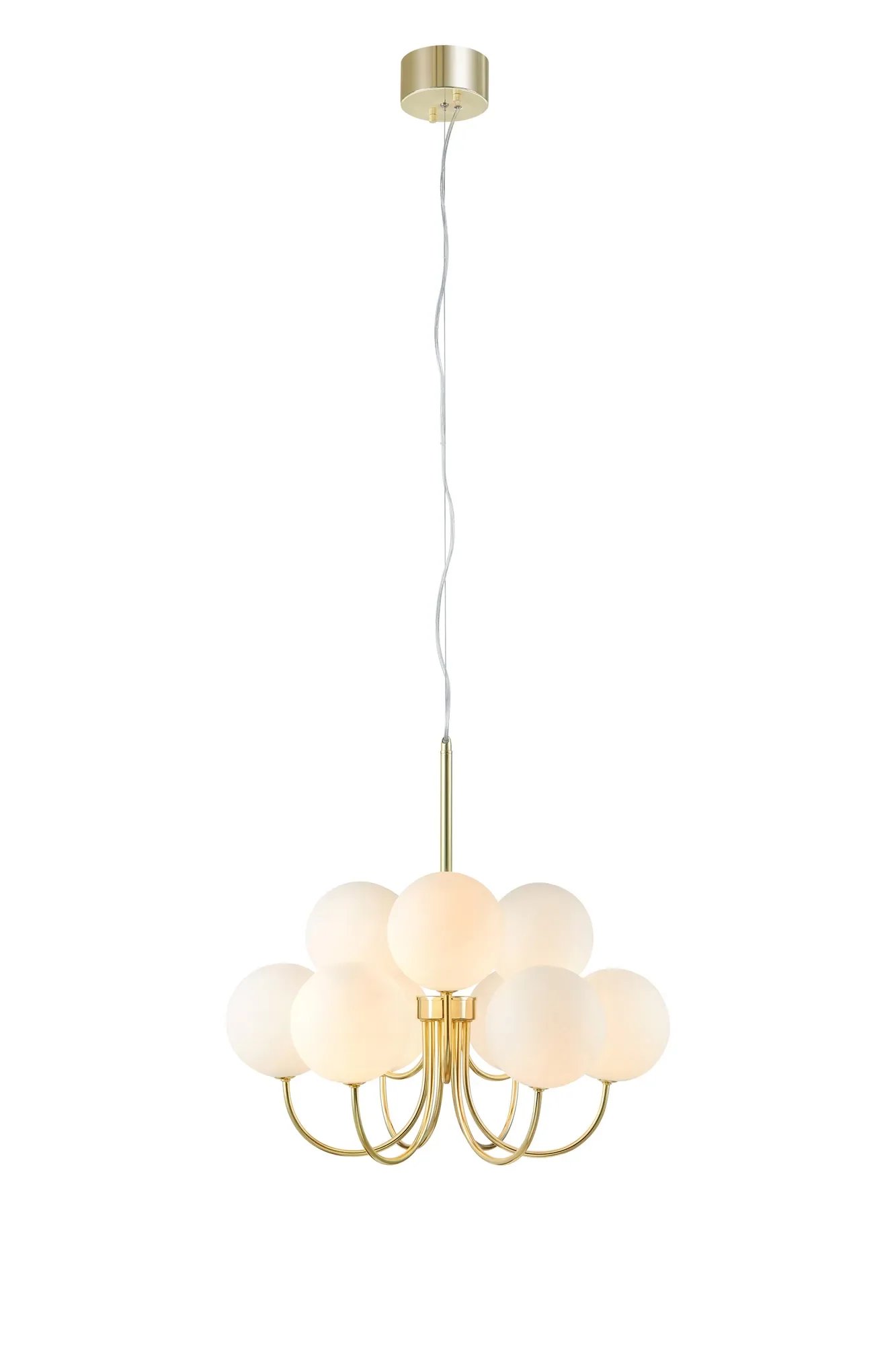 - Design: Zlatá (mosazná) konstrukce, 9 opálově bílých skleněných koulí