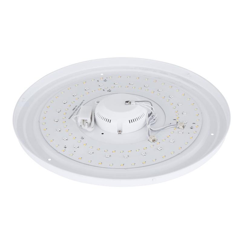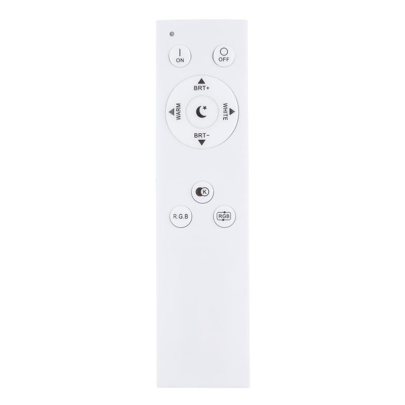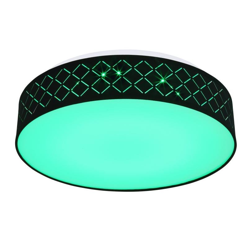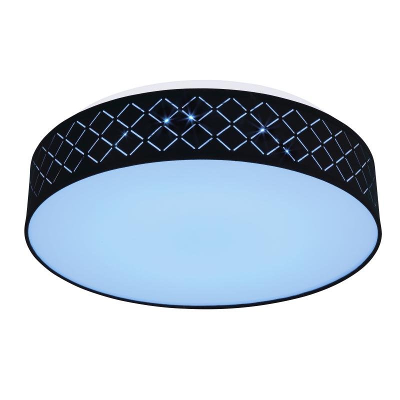 Stropní světlo kovové bílé, textil černý, akryl opál, paměťová funkce, noční světlo, stmívatelné, dálkové ovládání, měnič barev, barvy lze fixovat, duhový efekt, Ø 400, H: 110, LED 18W+RGB 5W 230V, 1440lm zdroj, 700lm výstup, 3000-6000K