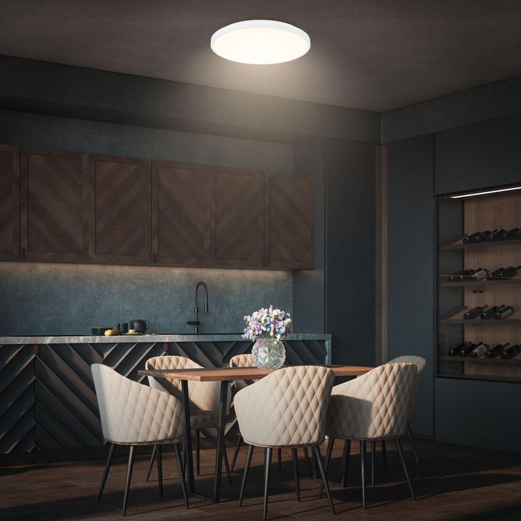 Výkonný LED modul o příkonu 22W poskytuje světelný tok 2400 lumenů v teplé bílé barvě (3000K), což vytváří útulnou atmosféru vhodnou do obývacích pokojů, ložnic, kuchyní i chodeb. Mléčný difuzor zajistí, že světlo je rovnoměrně rozptýleno bez oslnění a stínů. Díky průměru 33 cm a nízké výšce 6 cm je svítidlo vhodné i do místností s nižšími stropy.