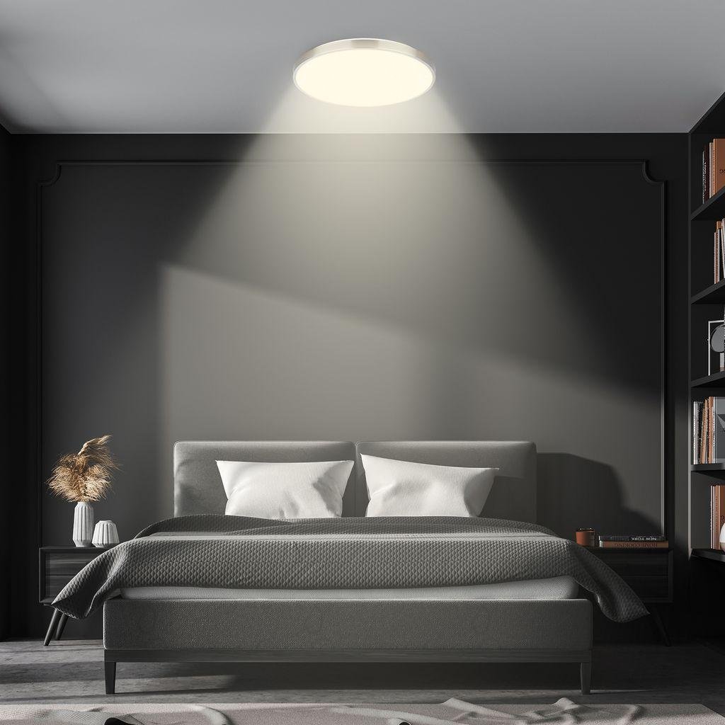 Kryt svítidla v matném niklu doplňuje čistě bílé tělo, které podtrhuje univerzální využití svítidla v obývacím pokoji, ložnici, kuchyni i na chodbě. Průměr 38 cm a výška pouhých 6 cm umožňují instalaci i do prostor s nižším stropem.