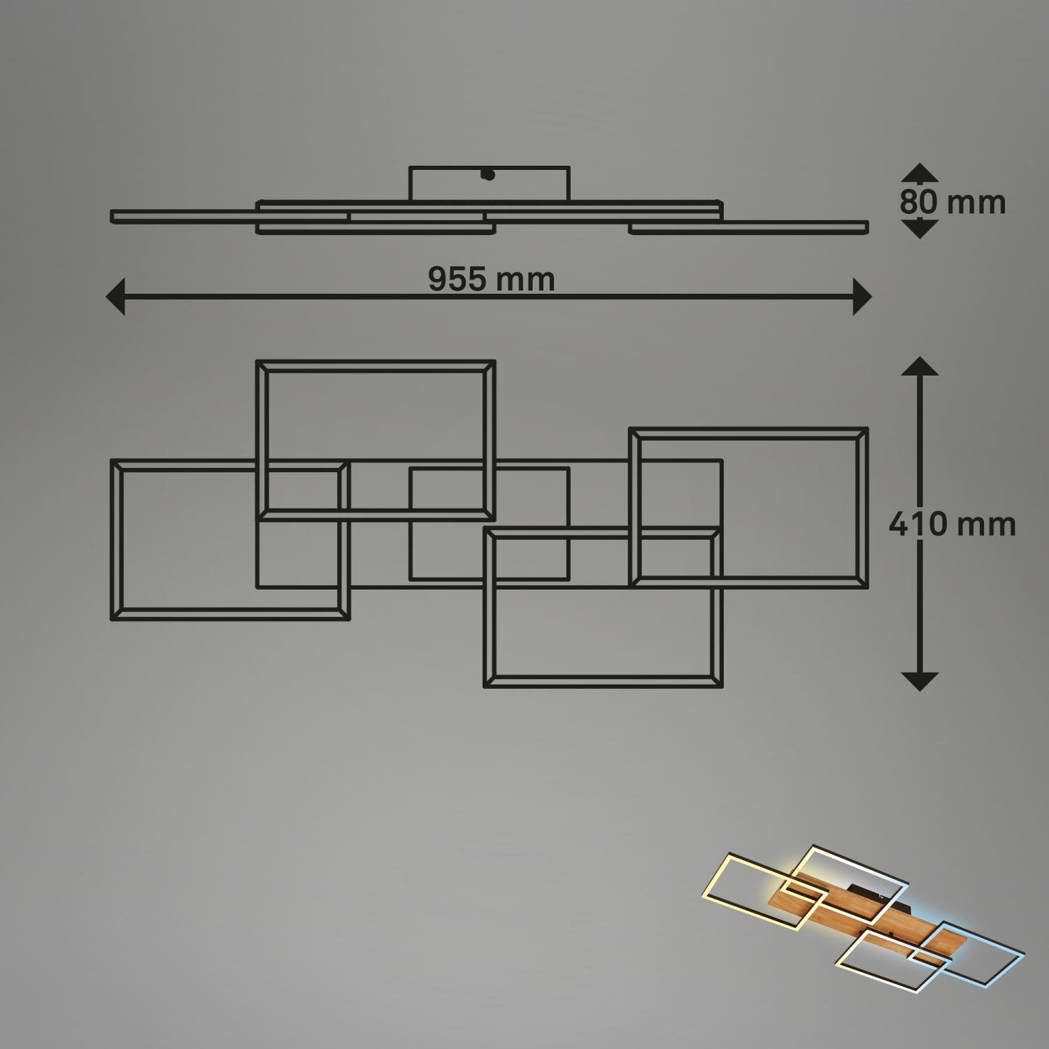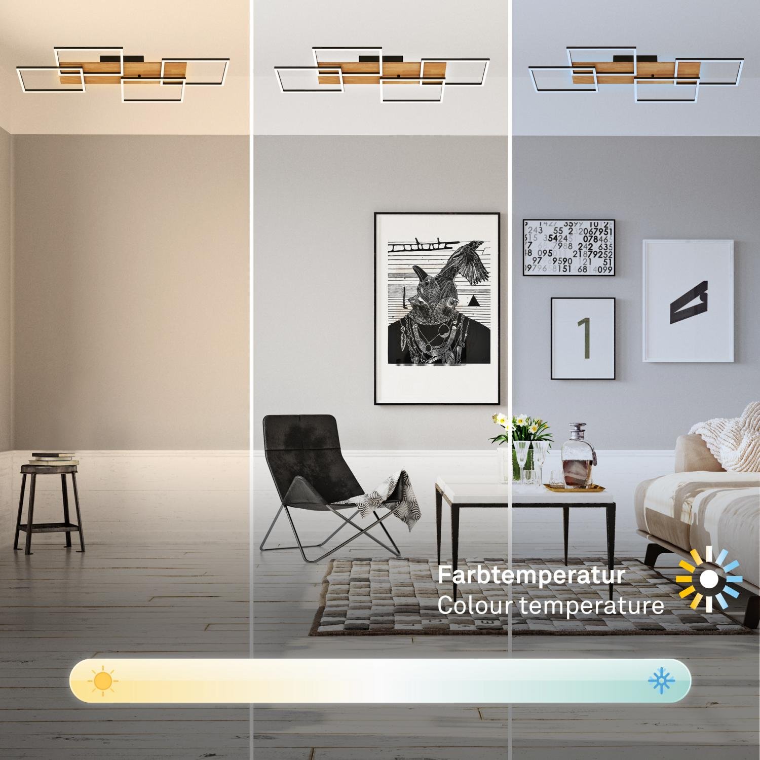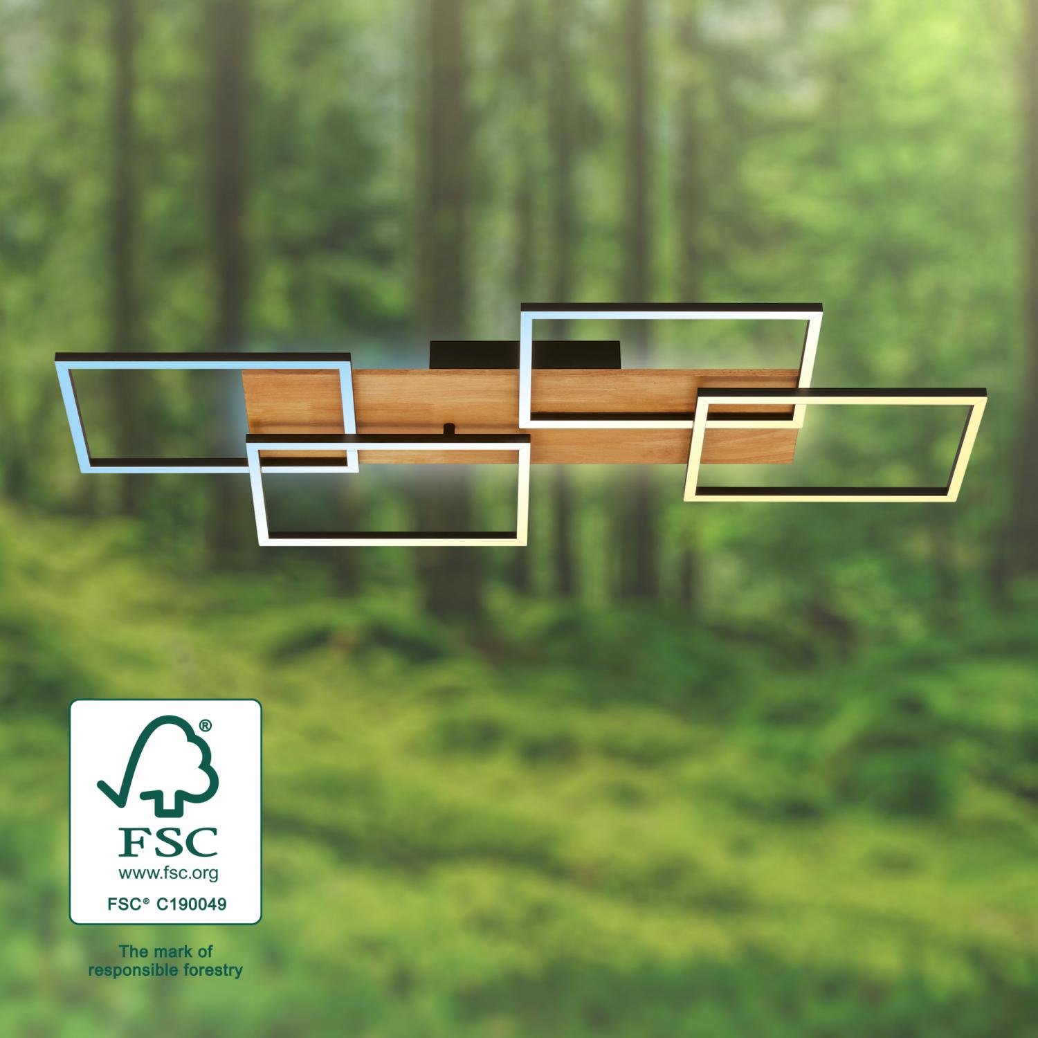 Stropní LED svítidlo Cornice kombinuje luxusní černé kovové rámy s teplými dřevěnými prvky, čímž vytváří originální a harmonický akcent pro každý moderní interiér. Čtyři geometricky řešené rámy a velkorysé rozměry 95,5 x 41 x 8,5 cm předurčují Cornice jako dominantní prvek obývacích pokojů, jídelen i pracovních prostor.