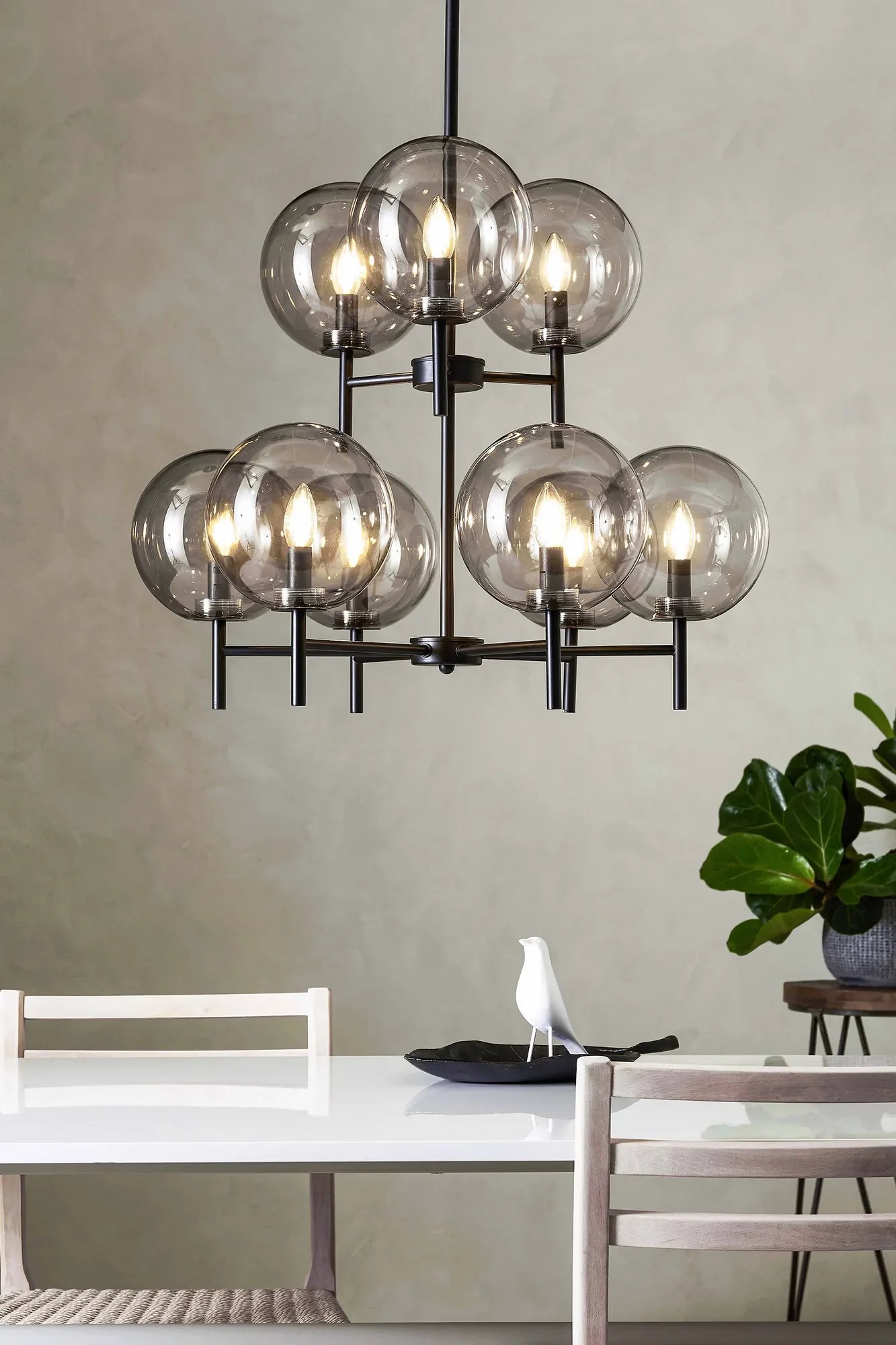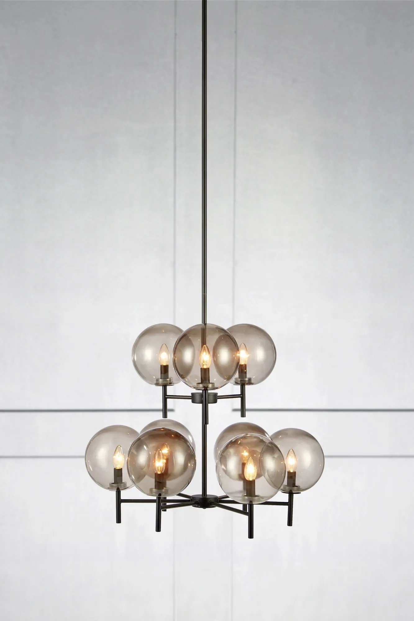 - Moderní design: Černá konstrukce v kontrastu s velkými kouřovými skleněnými koulemi
