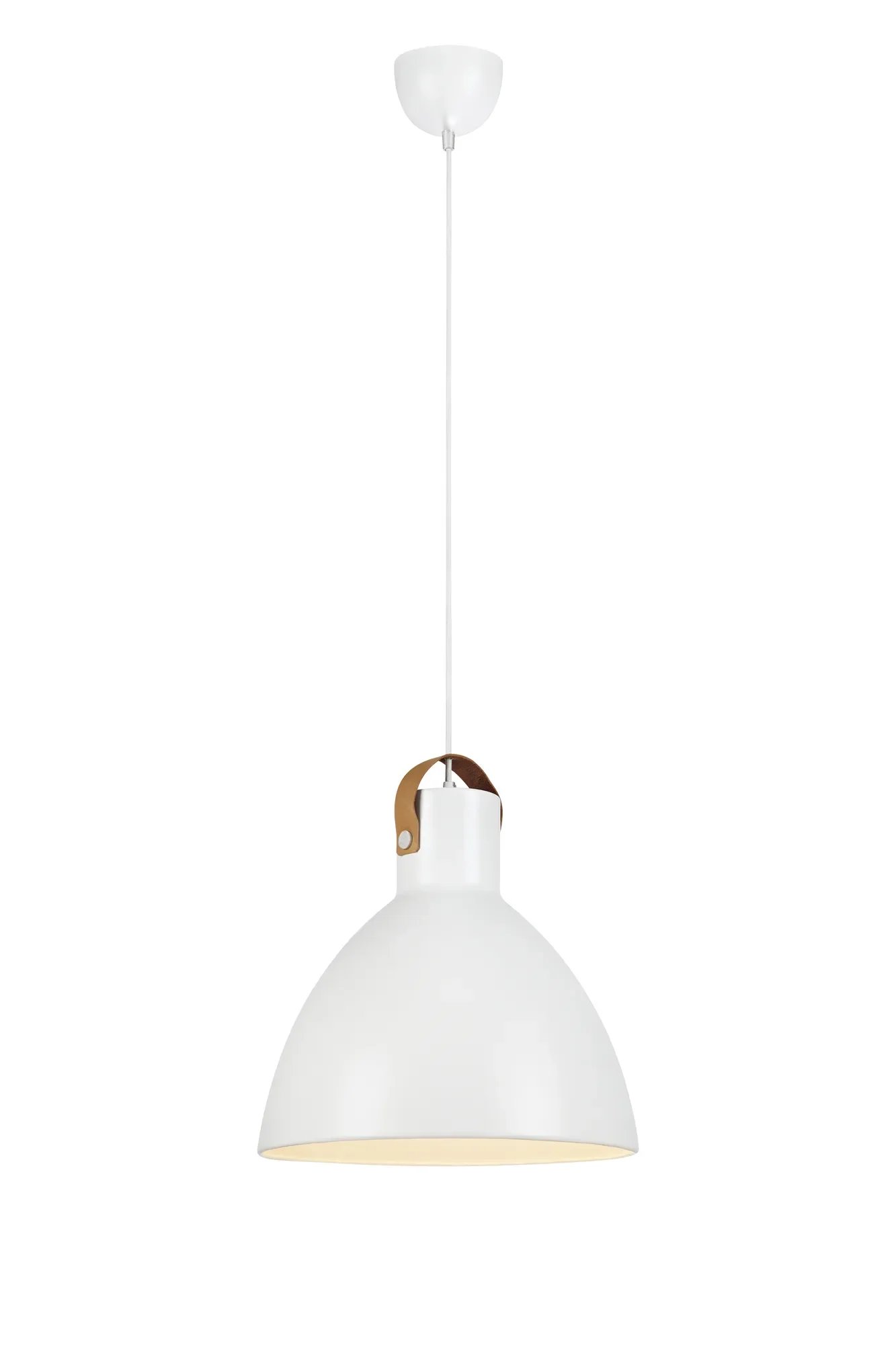 - Moderní skandinávský design – Matná bílá povrchová úprava s kontrastním koženým řemínkem dodává svítidlu osobitý charakter.