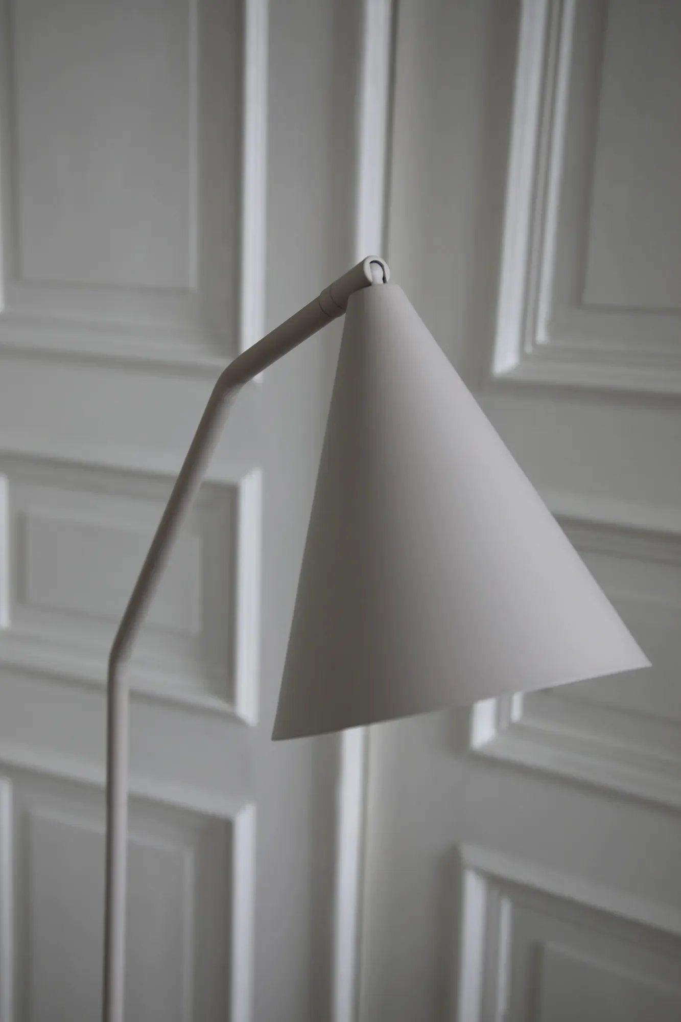 Kovové tělo v matné béžové má subtilní, vertikální proporci a je doplněné dekorativním kuželovým stínidlem. Stínidlo je otočné a nastavitelné, což usnadňuje přesné nasměrování světla na pracovní plochu nebo do zóny sezení. Spínač je integrovaný na zadní straně stínidla; napájení je řešeno transparentním kabelem s vidlicí do zásuvky.