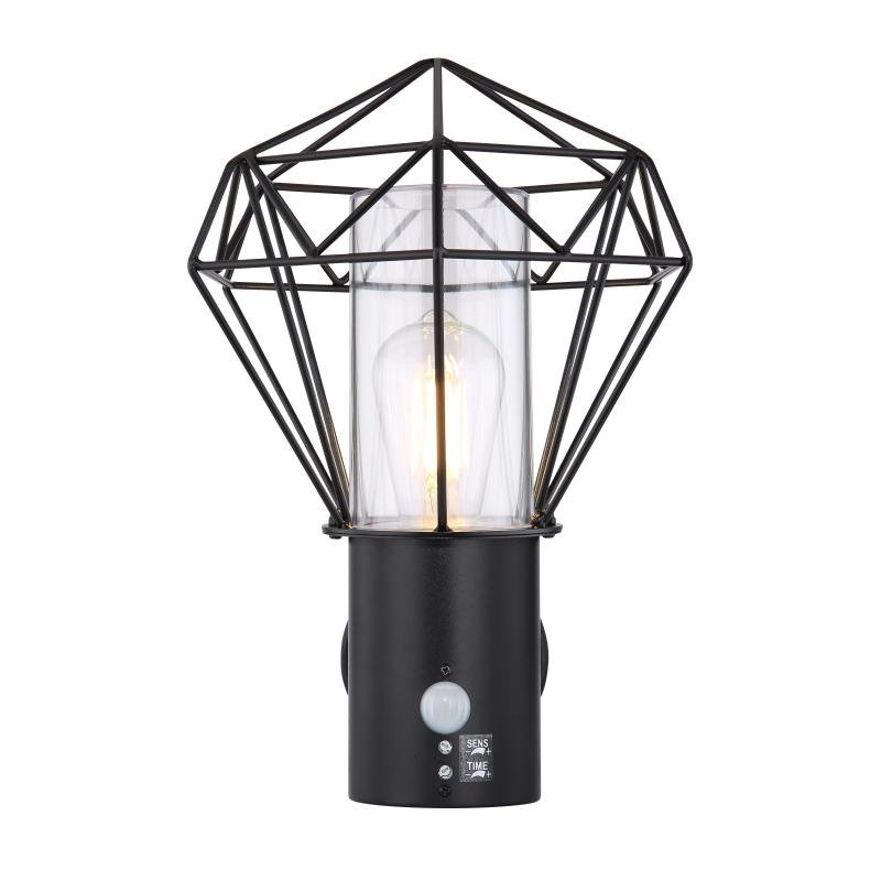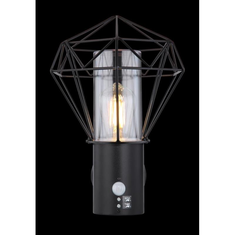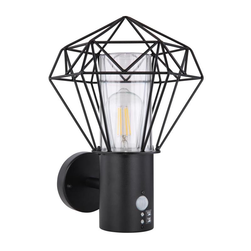 Venkovní svítidlo, nerez ocel černá, kov černý, plast průhledný, IP44, snímač: V: 1,8m, 90°, dosah max. 8m, ŠxV: 225x340, H: 275, bez žárovky 1xE27 LED, max. 15W 230V