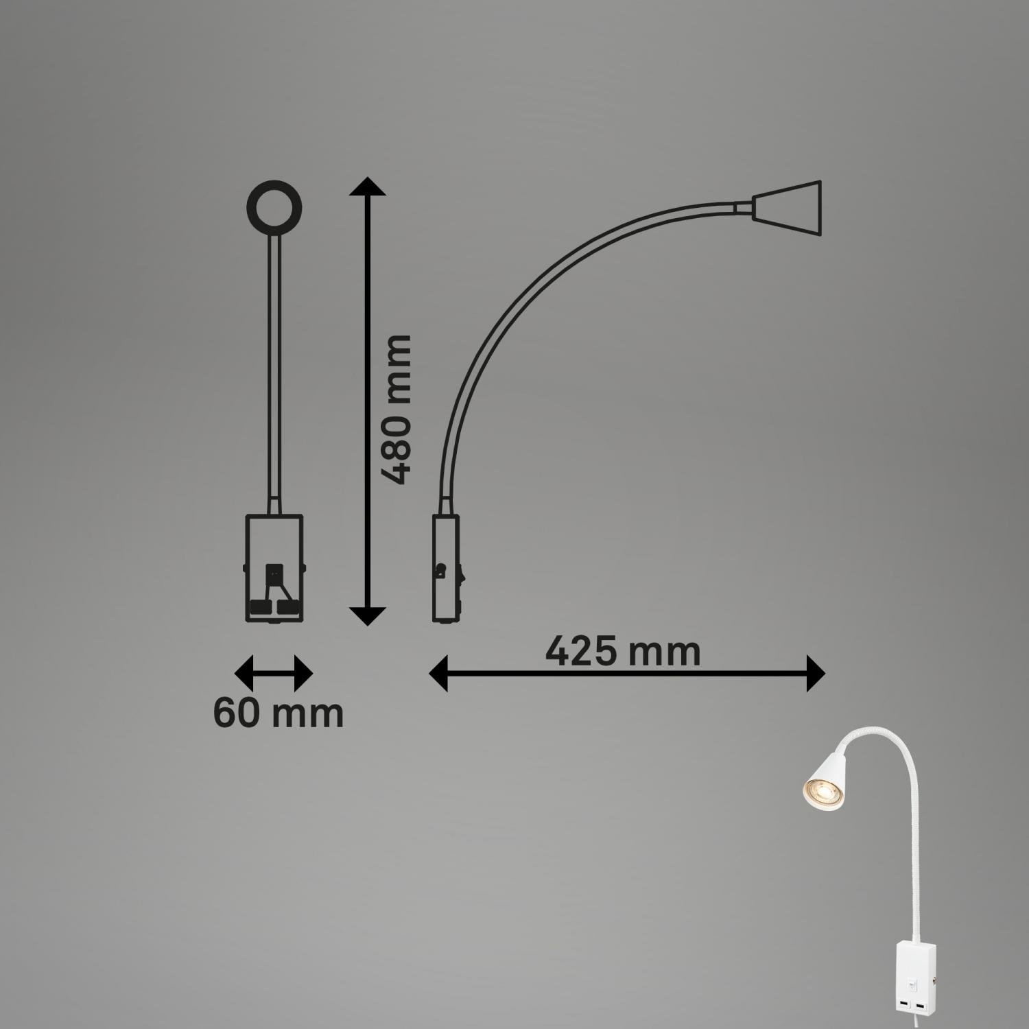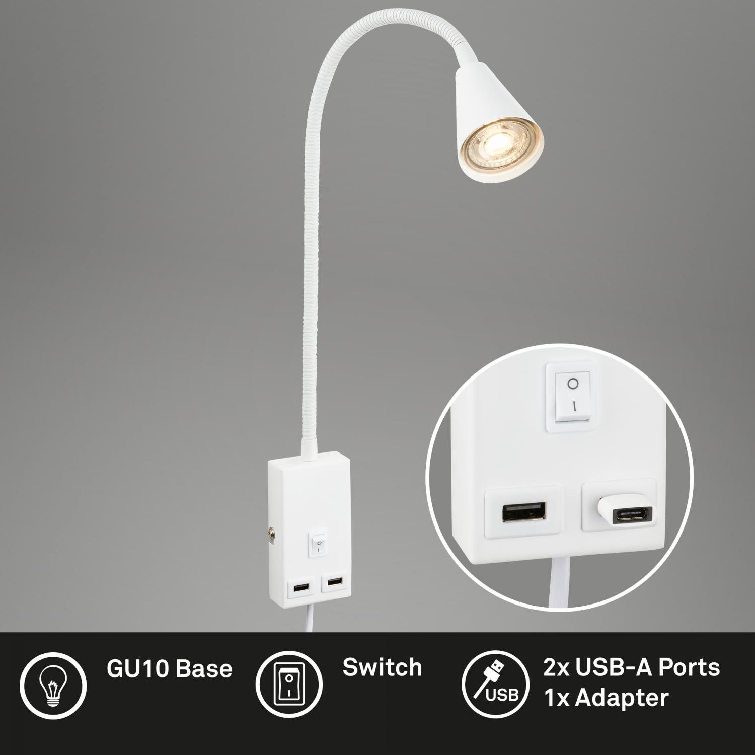 Justra lampa na čtení, nastavitelná, 2x USB porty, bílá - BRILONER