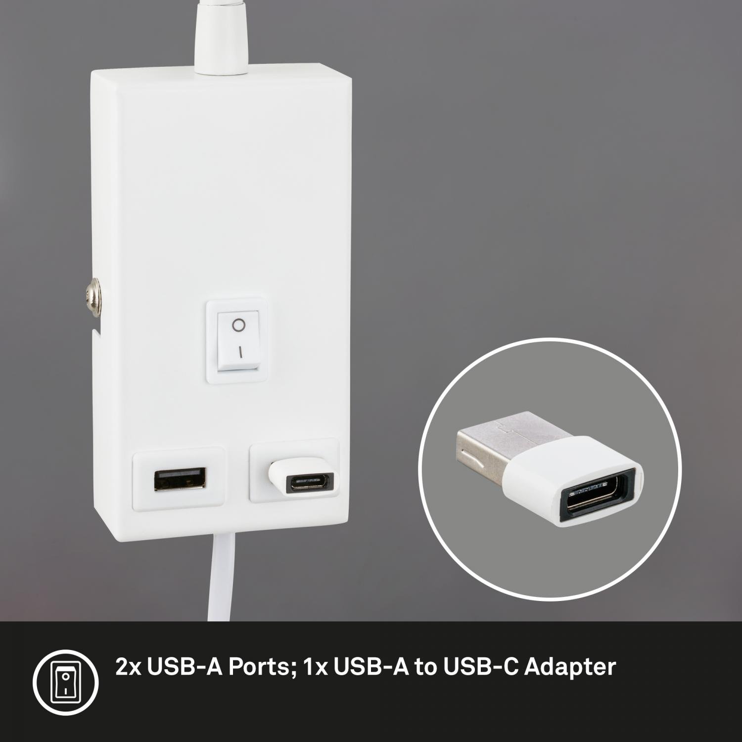 Unikátní výhodou této lampy jsou 2 integrované USB porty (5V, 4,5W) včetně adaptéru USB-A na USB-C. Můžete tak pohodlně nabíjet telefon, tablet nebo další zařízení přímo u postele či pracovního místa bez nutnosti hledat další zásuvku.
