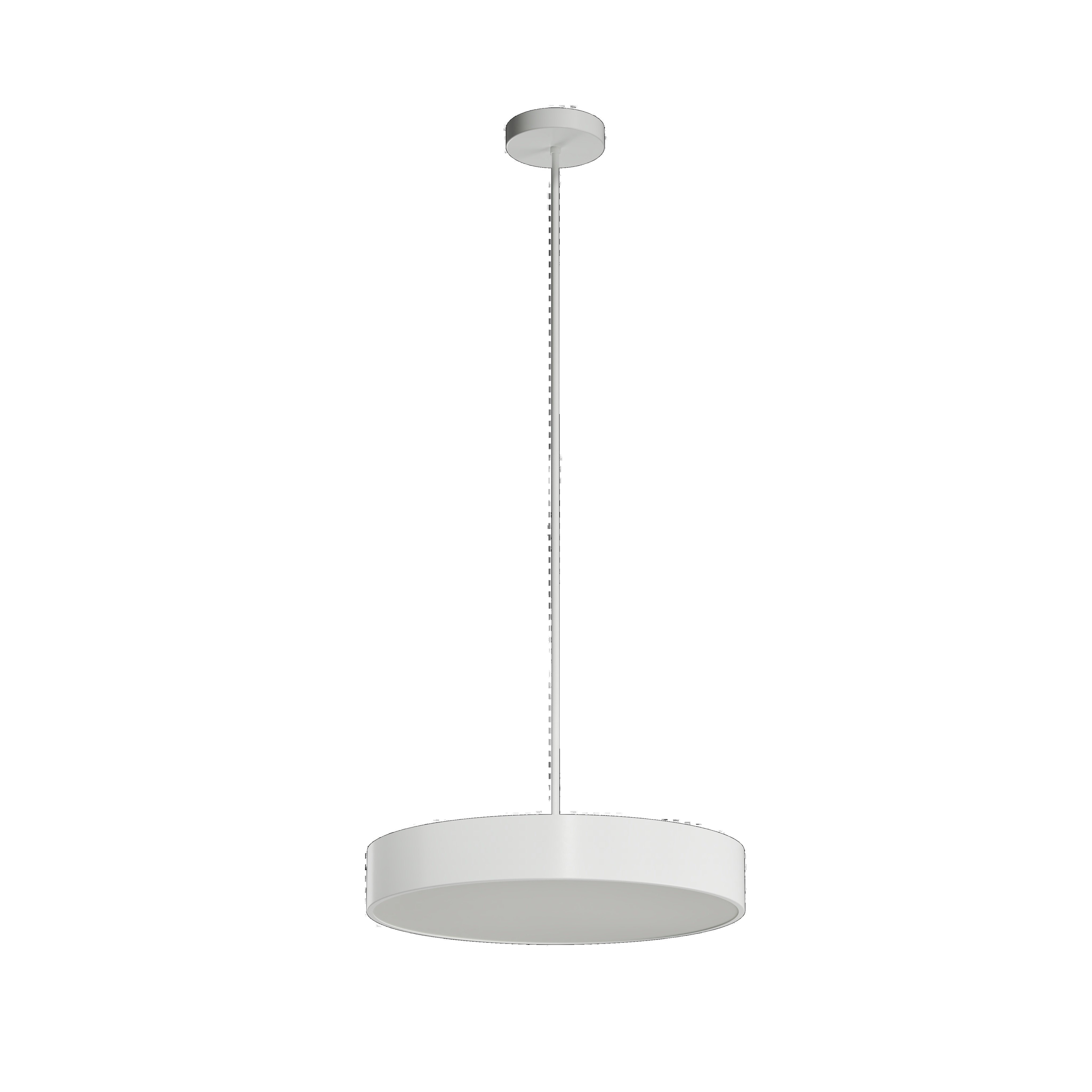 Bílé závěsné LED svítidlo ON/OFF s multipower funkcí a opálové prismatické stínidlo s dekorativním límcem. Tyčový závěs o délce 100 cm.