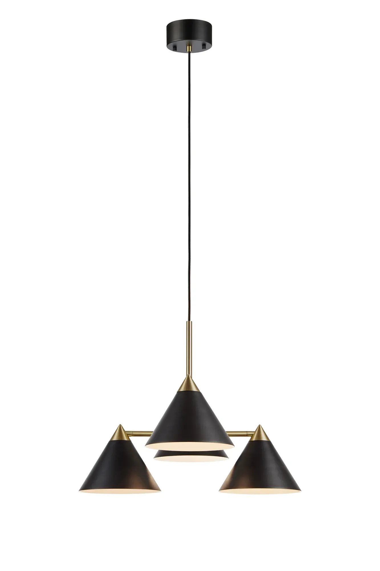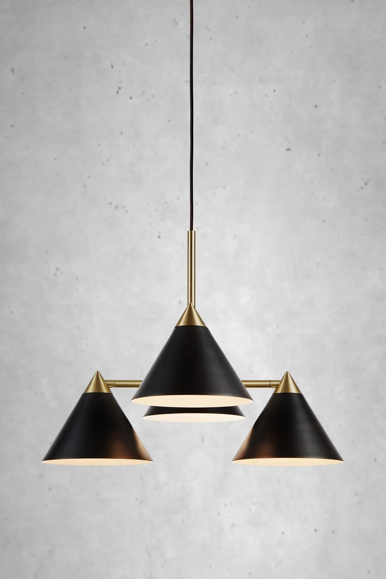 Závěsný lustr Markslöjd Klint přináší do vašeho interiéru neotřelou kombinaci moderního minimalismu a klasické elegance. Černé kovové tělo doplňují stylové akcenty v odstínu antické mosazi, které podtrhují jeho estetickou hodnotu. Svítidlo je vybaveno čtyřmi nastavitelnými stínidly ve tvaru kužele, díky čemuž si jednoduše nasměrujete světlo přesně tam, kde ho potřebujete – ideální nad jídelní stůl, pracovní kout nebo do obývacího pokoje.