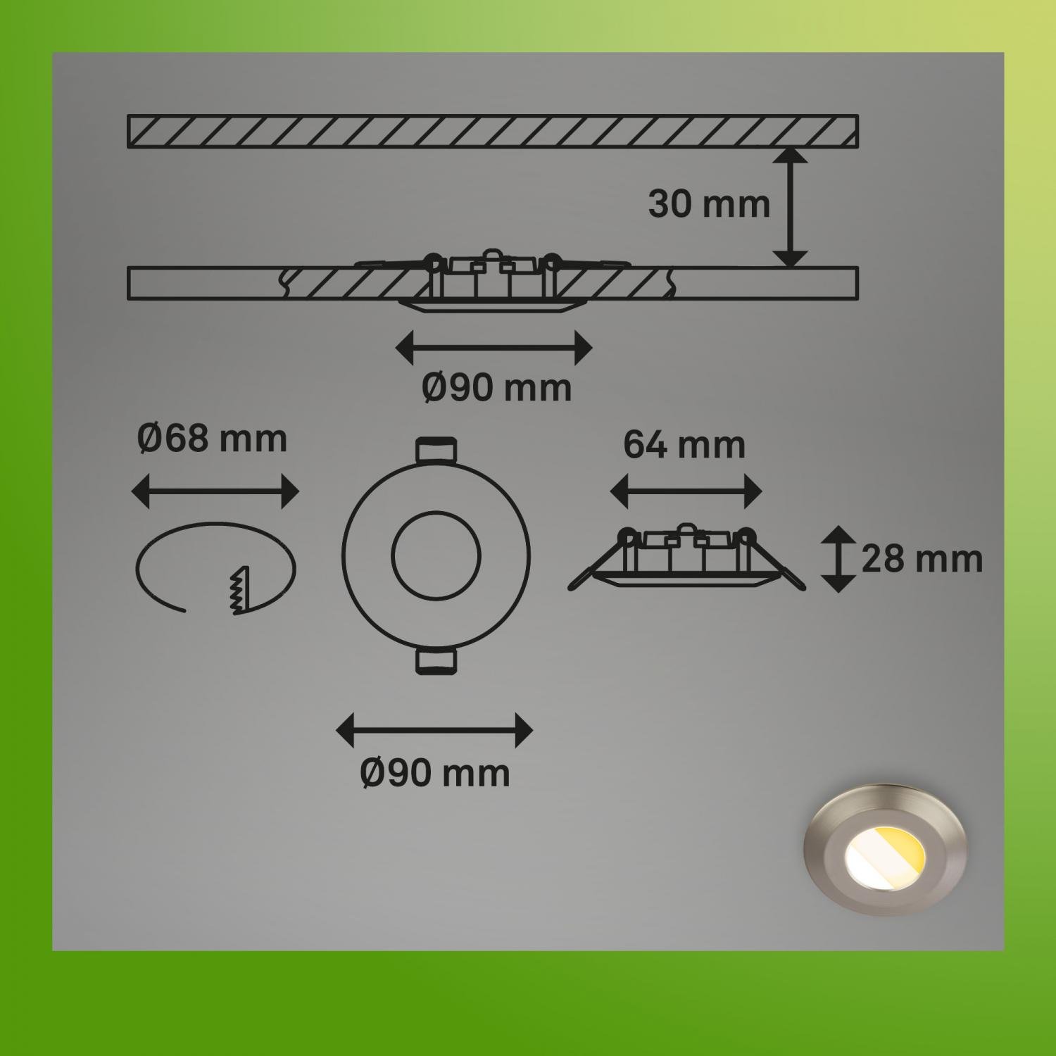 LED moduly jsou jednoduše vyměnitelné, což prodlužuje životnost celého svítidla a snižuje budoucí náklady na údržbu. Plně zapuštěné provedení (průměr 90 mm, výška 30 mm, požadovaná instalační otvor 68 x 40 mm) umožňuje elegantní a nenápadnou montáž do sádrokartonových i pevných stropů.