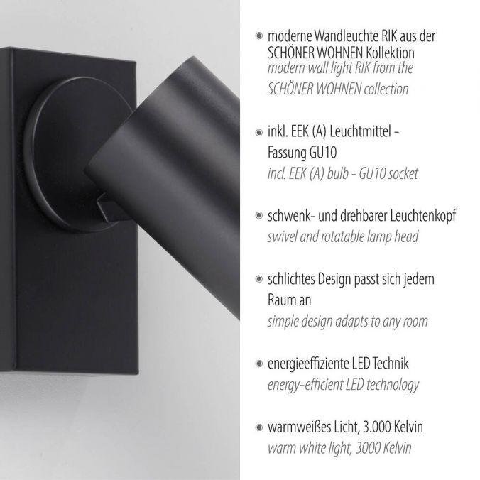 Jednoramenný LED spot RIK z kolekce Schöner Wohnen je určeno pro montáž na stěnu nebo strop a nabízí směrové, teplé bílé světlo s příjemnou atmosférou. Díky možnosti natáčení a naklápění je vhodné pro akcentní osvětlení v obytných i komunikačních prostorech. Hlavní roli svítidla představuje zvýraznění konkrétních zón nebo objektů v interiéru.