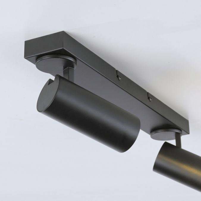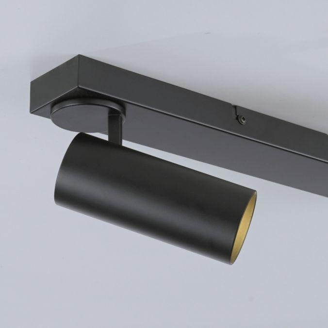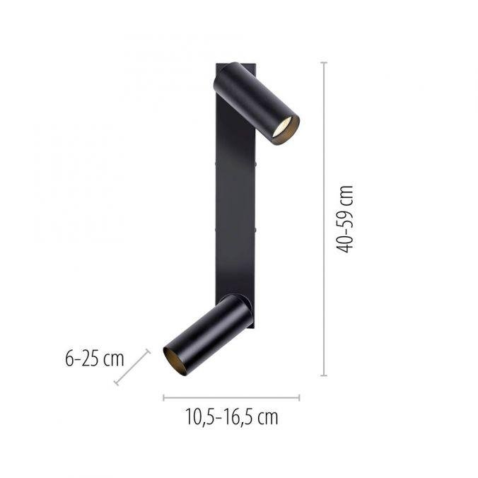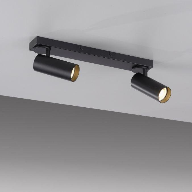 Minimalistické provedení s čistými liniemi podtrhuje černá povrchová úprava a hliníková konstrukce. Dva válcové spoty jsou uchyceny na podlouhlé základně a lze je samostatně otáčet i naklápět, což umožňuje přesné nasměrování světelného toku. Design svítidla je vhodný pro moderní interiéry, kde je kladen důraz na funkčnost a jednoduchost.