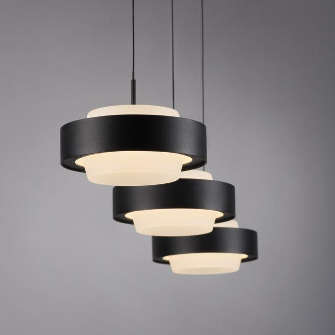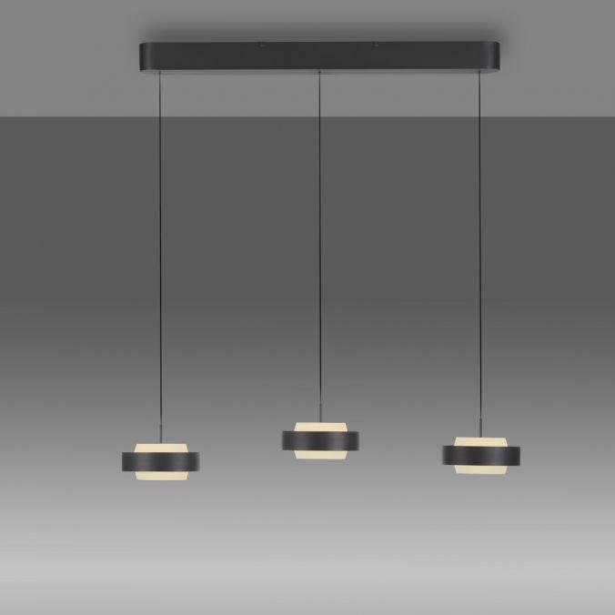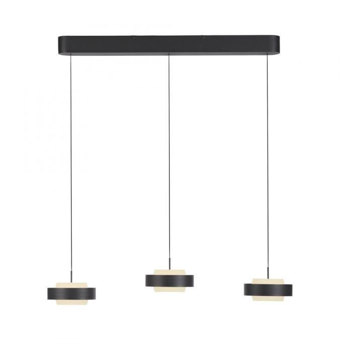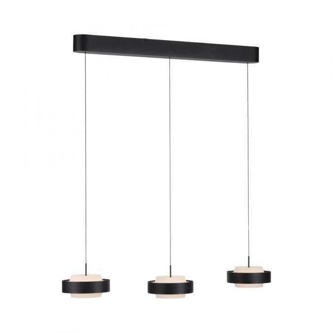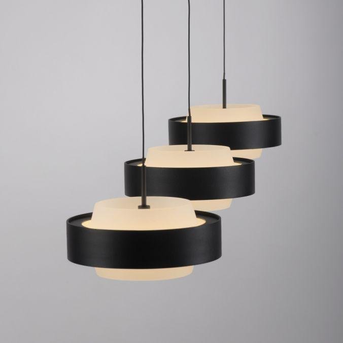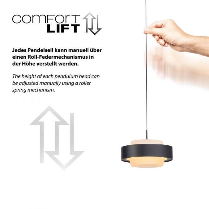 Svítidlo tvoří tři samostatné závěsné moduly s kruhovým profilem, zavěšené na subtilních kabelech z černě lakovaného železa. Minimalistická konstrukce v černé barvě podtrhuje moderní charakter a umožňuje snadné začlenění do současných interiérů. Výškově nastavitelný systém Comfort Lift umožňuje beznástrojové nastavení délky každého závěsu podle aktuální potřeby.