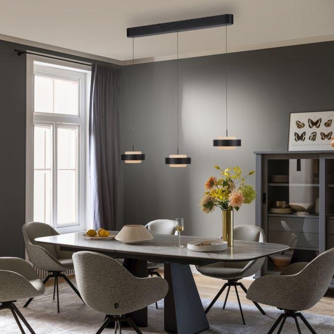 Závěsné svítidlo ELMO z kolekce Schöner Wohnen je určeno pro použití v obytných a společenských interiérech, kde plní roli hlavního nebo zónového osvětlení. Charakterizuje jej teplé bílé světlo (3000K) a možnost plynulého stmívání pomocí Tronic stmívače. Díky třem samostatným světelným zdrojům a individuálnímu výškovému nastavení každého závěsu lze svítidlo flexibilně přizpůsobit konkrétním požadavkům prostoru, například nad jídelní stůl, kuchyňský ostrůvek nebo do obývací části.