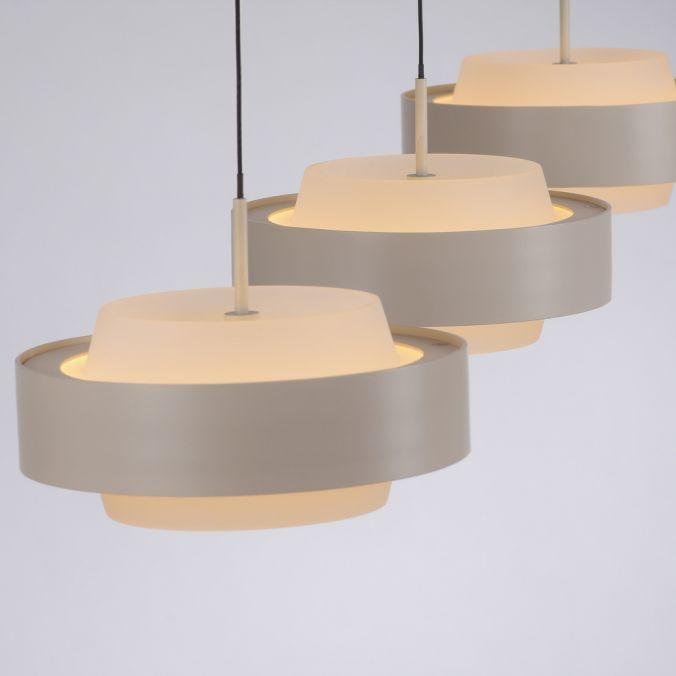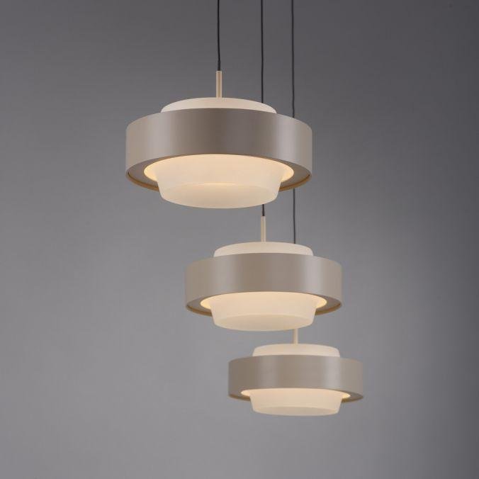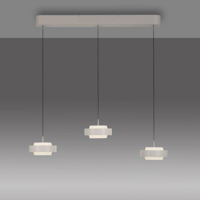 Svítidlo sestává ze tří samostatných závěsných těles s kruhovým profilem, zavěšených na subtilních lankách z podlouhlé stropní základny. Povrchové provedení v pískově bílé barvě podtrhuje čistotu tvaru a umožňuje snadné začlenění do současných interiérů. Hlavním konstrukčním materiálem je železo, které zajišťuje stabilitu i dlouhou životnost. Výškové nastavení jednotlivých závěsů je řešeno manuálním systémem Comfort Lift, což umožňuje přesné přizpůsobení svítidla konkrétním prostorovým požadavkům.