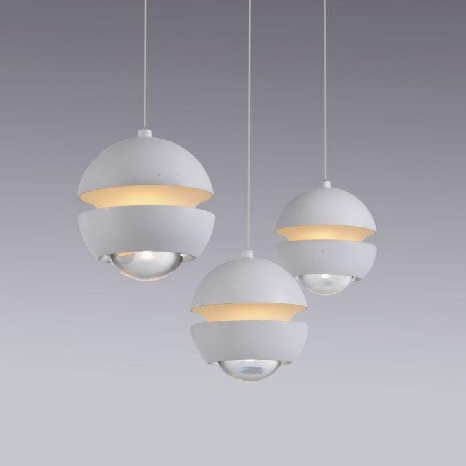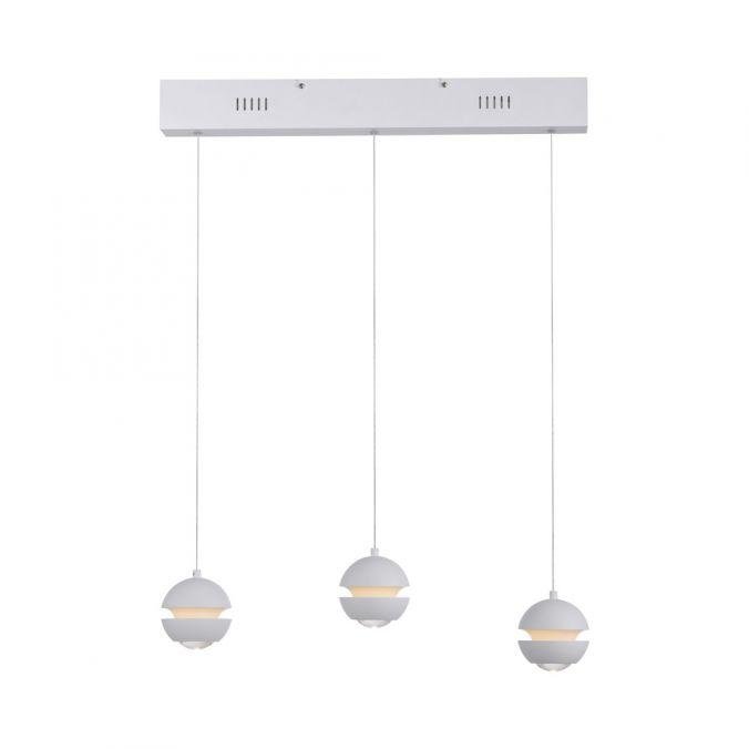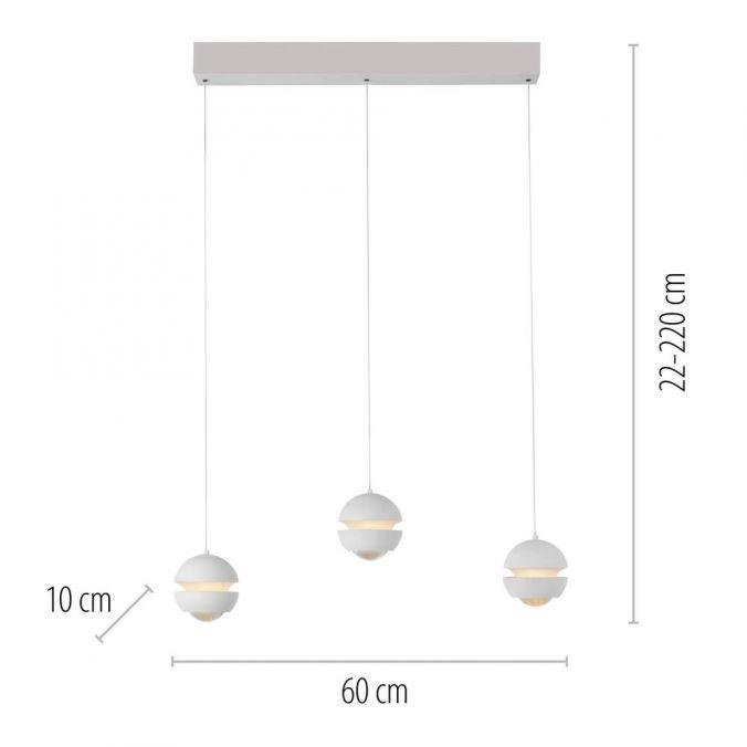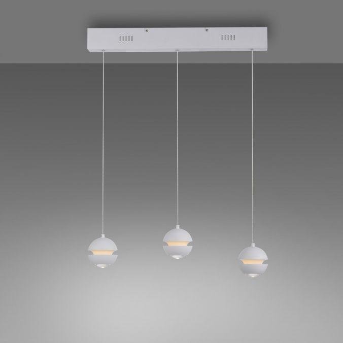 Svítidlo je tvořeno třemi kulovými světelnými tělesy zavěšenými na subtilních lankách z obdélníkové stropní základny. Povrchová úprava v matné bílé barvě a kombinace kovu a plastu podtrhují čistý, nadčasový vzhled. Každé závěsné rameno lze díky systému Comfort Lift snadno výškově nastavit, což přináší flexibilitu při umístění nad různě vysoké pracovní nebo jídelní plochy.