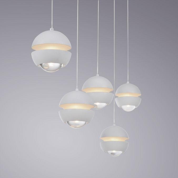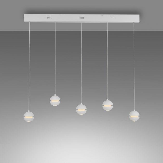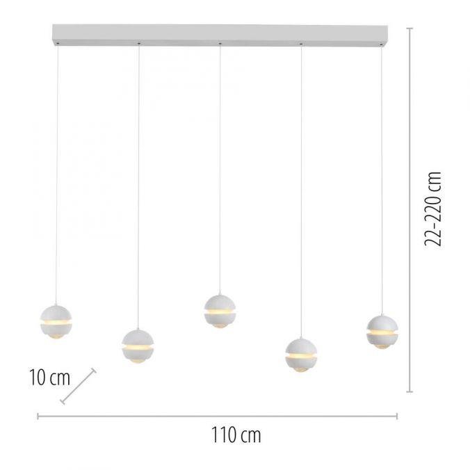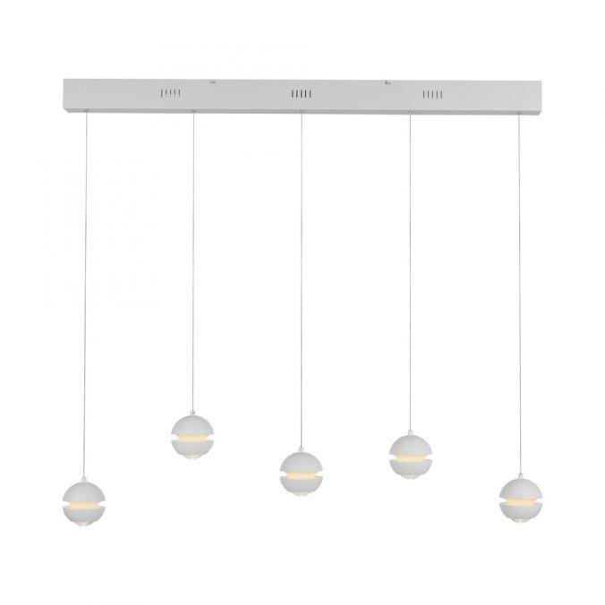 Minimalistická konstrukce v bílé barvě kombinuje kov a plast. Lineární základna nese pět samostatných závěsů zakončených kulovými difuzory, které působí geometricky čistě a současně vytvářejí jemný světelný akcent v prostoru. Každý závěs lze individuálně výškově nastavit.