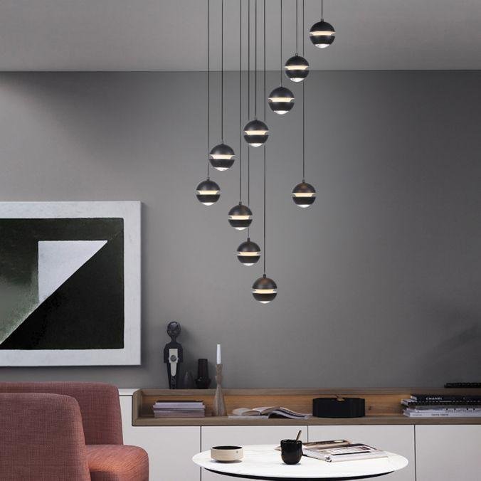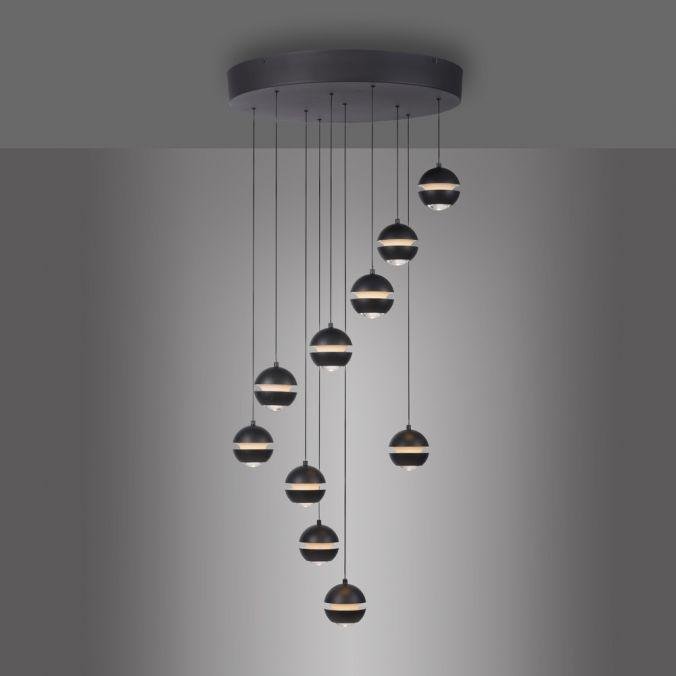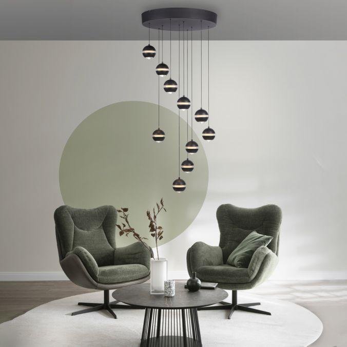 Dominantní kruhová základna v černé barvě nese deset závěsných ramen zakončených kulovými světelnými tělesy z kovu a plastu. Minimalistické pojetí a precizní zpracování podtrhují současný charakter svítidla, které v prostoru působí jako světelná instalace. Výškové nastavení jednotlivých ramen pomocí systému Comfort Lift umožňuje vytvořit dynamickou kompozici a přizpůsobit svítidlo konkrétní situaci v interiéru.
