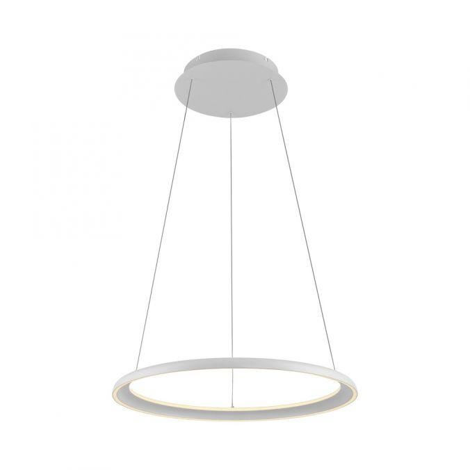 Kruhové tělo svítidla je vyrobeno z železa v matné bílé barvě. Minimalistický design podtrhuje subtilní závěs na třech lankách, které umožňují výškové nastavení svítidla pomocí systému Comfort Lift. Výrazná kruhová forma působí v prostoru elegantně a současně nenápadně.