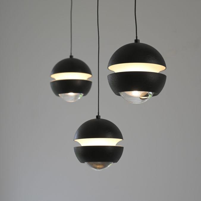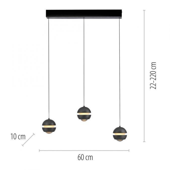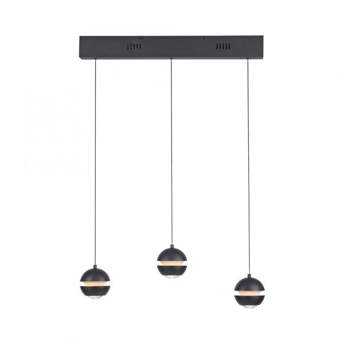 Konstrukce svítidla je tvořena třemi samostatnými závěsnými rameny, zakončenými kulovými difuzory. Hlavní část je vyrobena z kovu v černé barvě, doplněná plastovými prvky, které zajišťují rovnoměrné rozptýlení světla. Minimalistický tvar a decentní barevné provedení podporují univerzální využití v moderních interiérech.