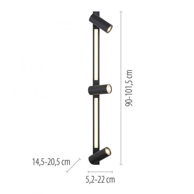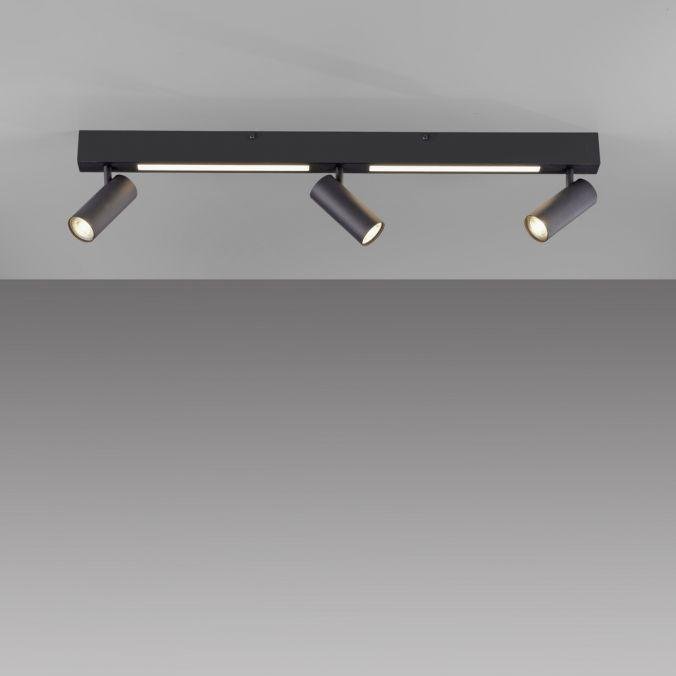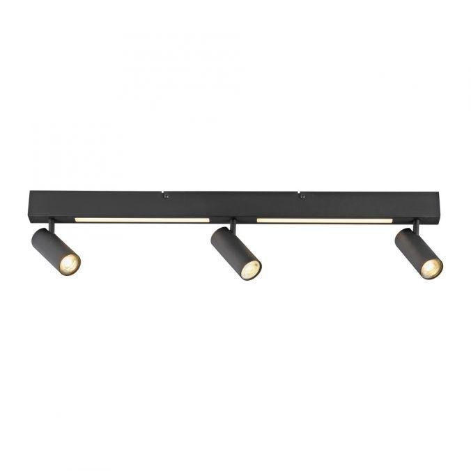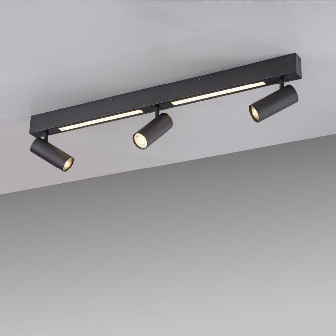 Konstrukce svítidla je tvořena podlouhlým profilem z černě lakovaného železa, na kterém jsou umístěny tři válcové spoty. Ty lze individuálně natáčet a směrovat podle potřeby. Minimalistické provedení v matné černé působí technicky čistě a nenápadně, což umožňuje začlenění do moderních i industriálně laděných interiérů. Integrovaná LED lišta v těle svítidla doplňuje funkci spotů o plošné osvětlení.