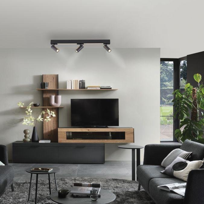 Lineární stropní svítidlo s třemi samostatně natáčitelnými spoty a integrovanou LED lištou poskytuje kombinaci směrového a plošného osvětlení. Světlo v teplé bílé barvě je vhodné pro obytné i komunikační prostory, kde je žádoucí variabilita nasvícení a možnost volby světelné atmosféry. Hlavní roli zde hraje flexibilní akcentní a zónové osvětlení s možností odděleného ovládání jednotlivých částí svítidla.