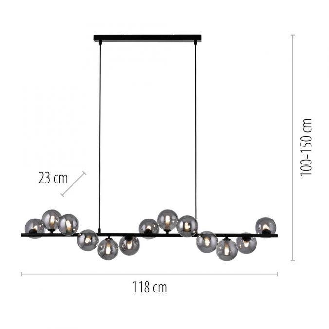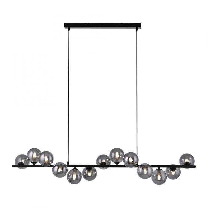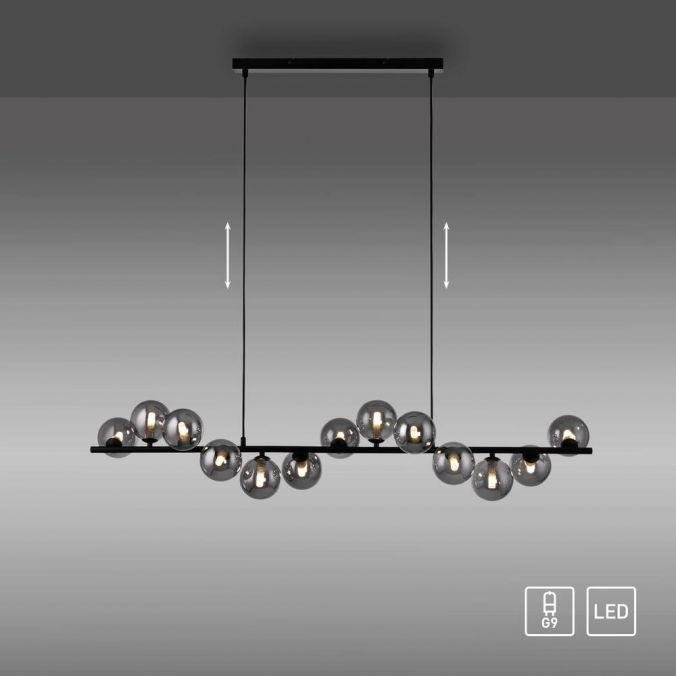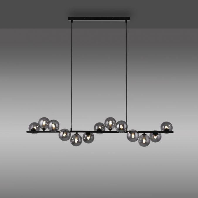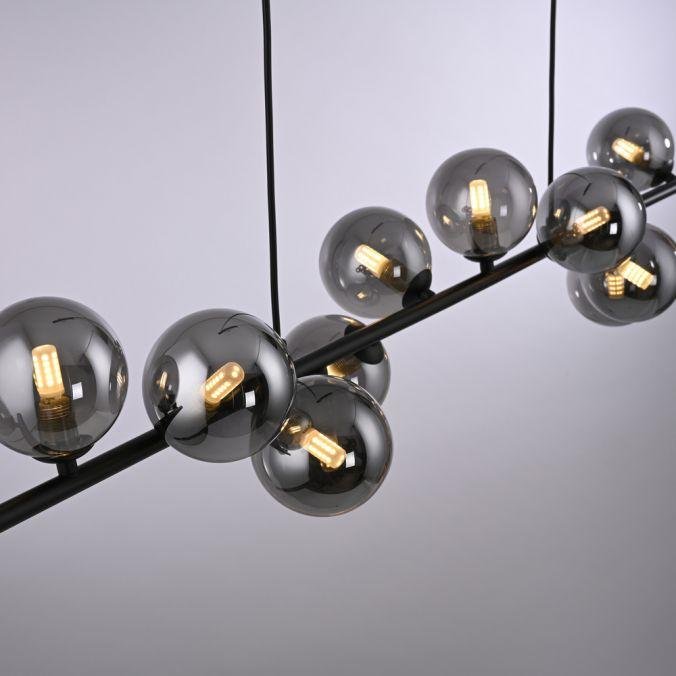 Konstrukce svítidla je tvořena podlouhlou černou kovovou základnou, na které jsou asymetricky rozmístěny kouřové skleněné koule. Tyto koule slouží jako difuzory a podtrhují moderní charakter svítidla. Výšková nastavitelnost umožňuje přizpůsobení svítidla konkrétním prostorovým požadavkům, například nad jídelním stolem nebo v obývacím prostoru s vyšším stropem.