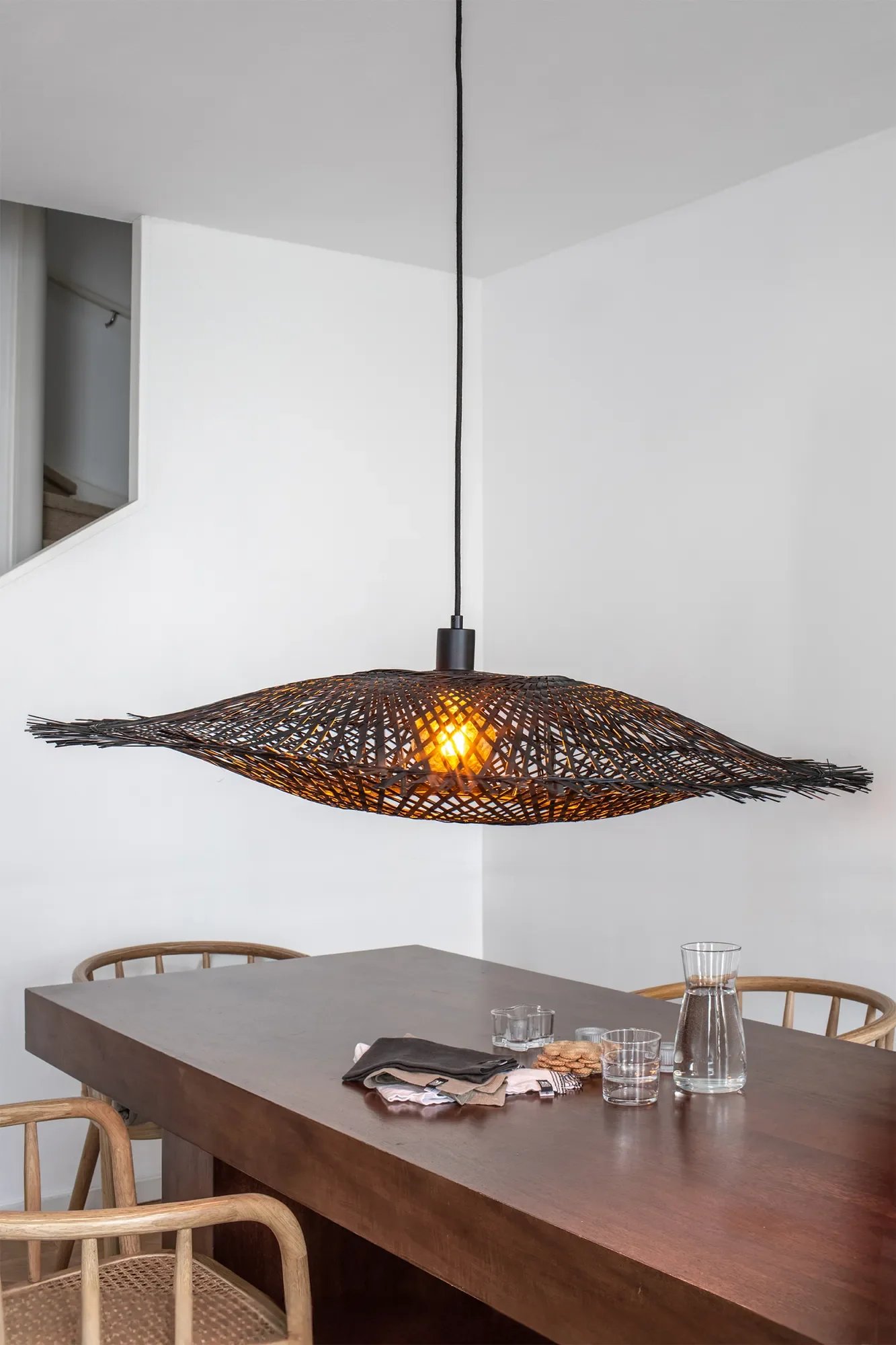 Svítidlo Kumo skvěle vynikne nad jídelním stolem, v obývacím pokoji nebo ložnici. Díky svému rozměru je ideální volbou pro větší prostory, kde se stane výrazným designovým prvkem. Doporučujeme použít dekorativní žárovku s paticí E27, která podtrhne působivou kresbu bambusového výpletu.