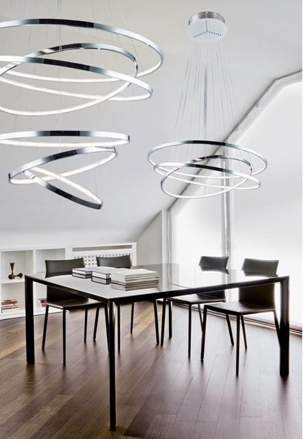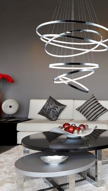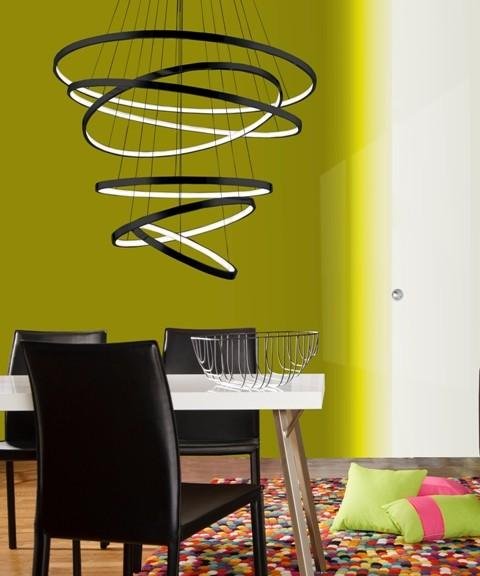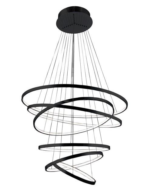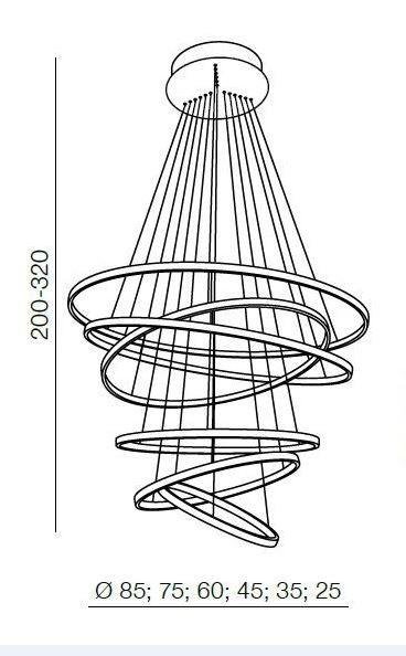 Závěsné stmívatelné svítidlo Wheel 6 Long značky Azzardo o celkovém průměru 85 cm je skvělým řešením pro nasvícení velkých místností, jako jsou obývací pokoj, kuchyň, jídelna či pracovna. Zároveň se hodí do kanceláří a zasedacích místností. Jeho nápaditý design, který tvoří šestice mezi sebou propletených tenkých kruhů, zaujme v každém moderně zařízeném interiéru. Kulatá základna je zhotovena z kovu s matně černou povrchovou úpravou, vede z ní 18 závěsných lanek, které lze výškově nastavit až do délky 3,2 m. Šest zavěšených kruhů o průměrech 25 cm, 35cm, 45 cm, 60 cm, 75 cm a 80 cm je taktéž vyrobeno z kovu s matně černou povrchovou úpravou a skrývají akrylové difuzory s integrovaným výkonným LED zdrojem o celkovém příkonu 1 x 140 W. Vyzařovaný svit dosahuje svítivosti až 8400lm a jeho světlo o teplotě chromatičnosti 3000K (neutrální bílá barva) lze stmívat. Krytí IP20 je určeno pro vnitřní použití. Svítidlo je napájeno ze sítě na 230 V a vztahuje se na něj záruka 3 roky.