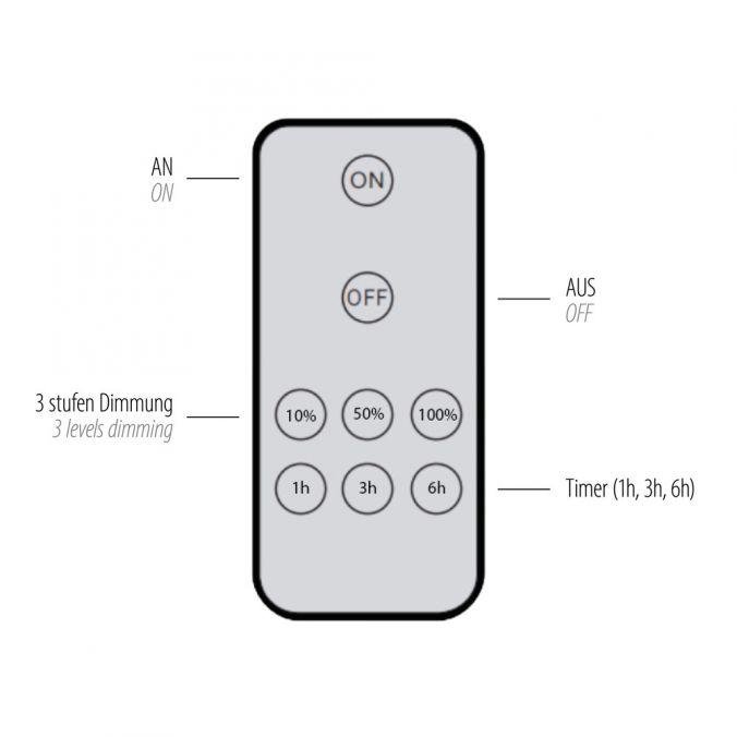 Svítidlo vyzařuje teplé bílé světlo (3000 K), které je vhodné pro navození příjemné atmosféry v interiéru. Světelný tok 250 lm odpovídá spíše dekorativní nebo orientační funkci, nikoli hlavnímu osvětlení prostoru. Stmívání pomocí dálkového ovladače umožňuje přesné nastavení intenzity podle aktuální potřeby. Paměťová funkce uchovává poslední zvolenou úroveň jasu, což je praktické zejména při opakovaném použití.