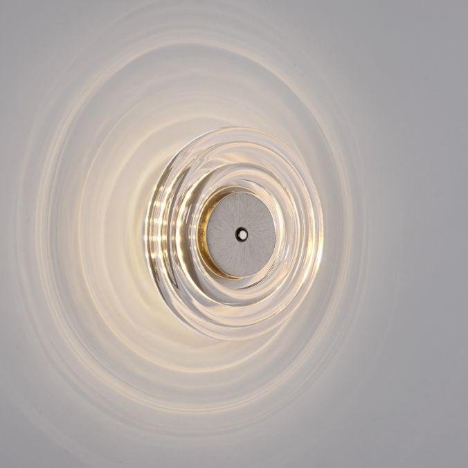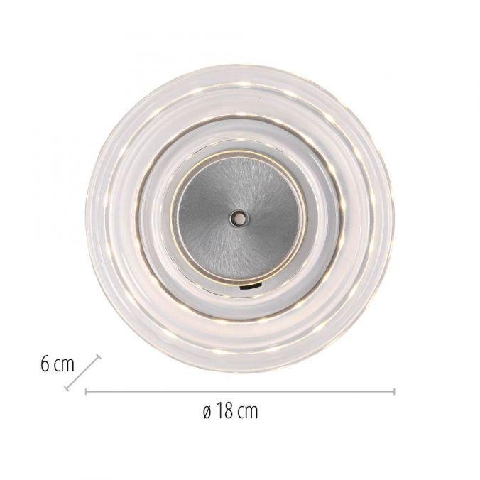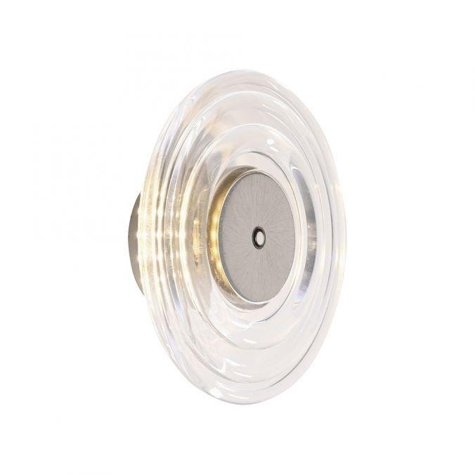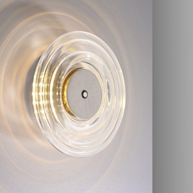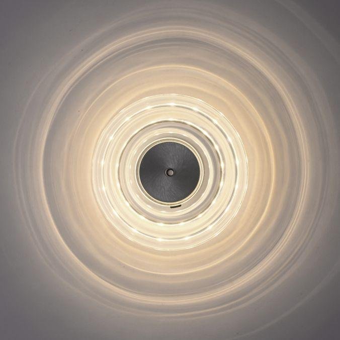 Kruhové tělo svítidla kombinuje ocelový střed s transparentním plastovým difuzorem, který zajišťuje rozptyl světla a vytváří výrazné světelné efekty na okolní stěně. Povrch v ocelovém provedení podtrhuje moderní charakter svítidla. Konstrukce je lehká a umožňuje snadnou montáž i na místech bez elektrické přípojky.