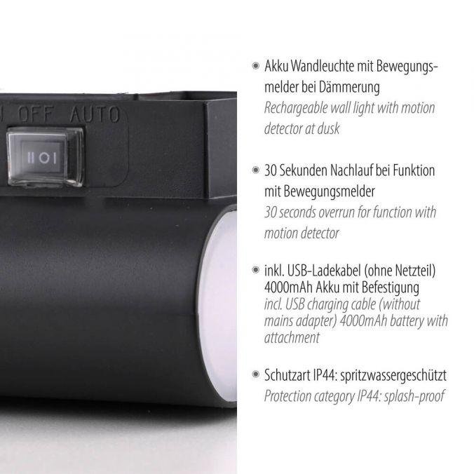 Kód / označení výrobce: LED nástěnné svítidlo na baterie AKKU-ZIDDY, černá, pohybové čidlo, nabíjecí, 3000K - JUST LIGHT