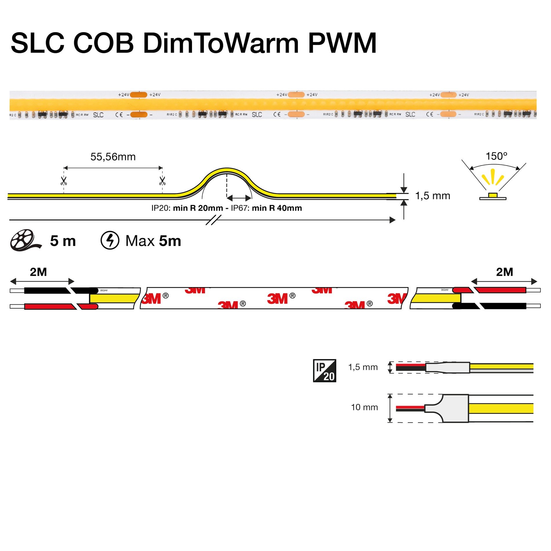 Pásek je osazen hustě rozmístěnými LED čipy (576 LED/m) na desce plošných spojů o šířce 10 mm a výšce 1,5 mm. Konstrukce bez viditelných bodových zdrojů zajišťuje souvislou světelnou linii bez rušivých stínů. Povrchové provedení je neutrální, určené pro integraci do profilů, podhledů nebo nábytkových prvků. Délka pásku je 5 metrů, s možností dělení po 55,56 mm.