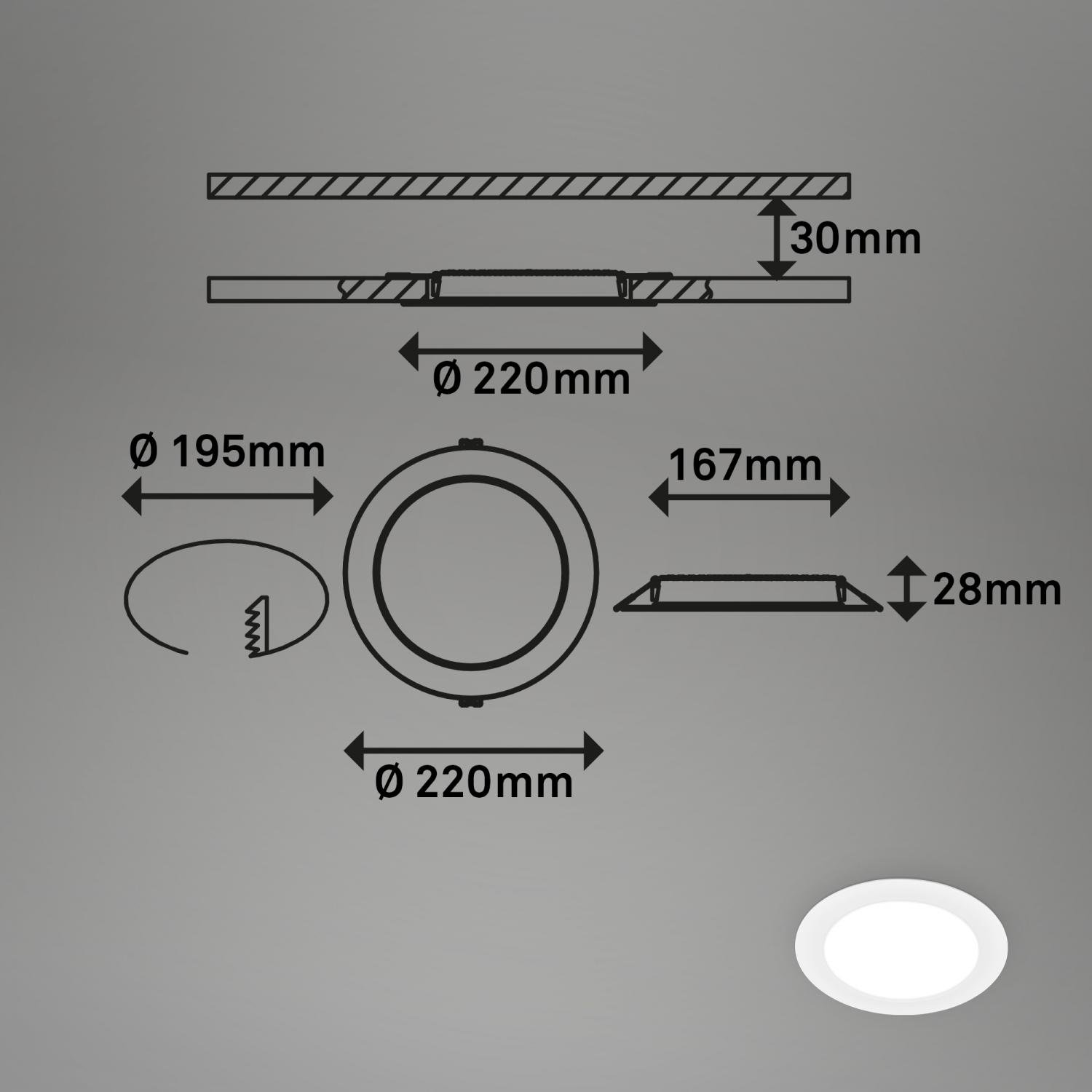 Vestavné LED bodové svítidlo BRILONER o průměru 220 mm je perfektní volbou pro všechny klienty, kteří vyžadují kvalitní osvětlení v elegantním a minimalistickém provedení. Ultra plochý design s výškou pouhých 30 mm umožňuje instalaci i v prostorách s omezenou hloubkou stropu a zároveň zachovává čistý a nenápadný vzhled, který podtrhne charakter vašeho interiéru.