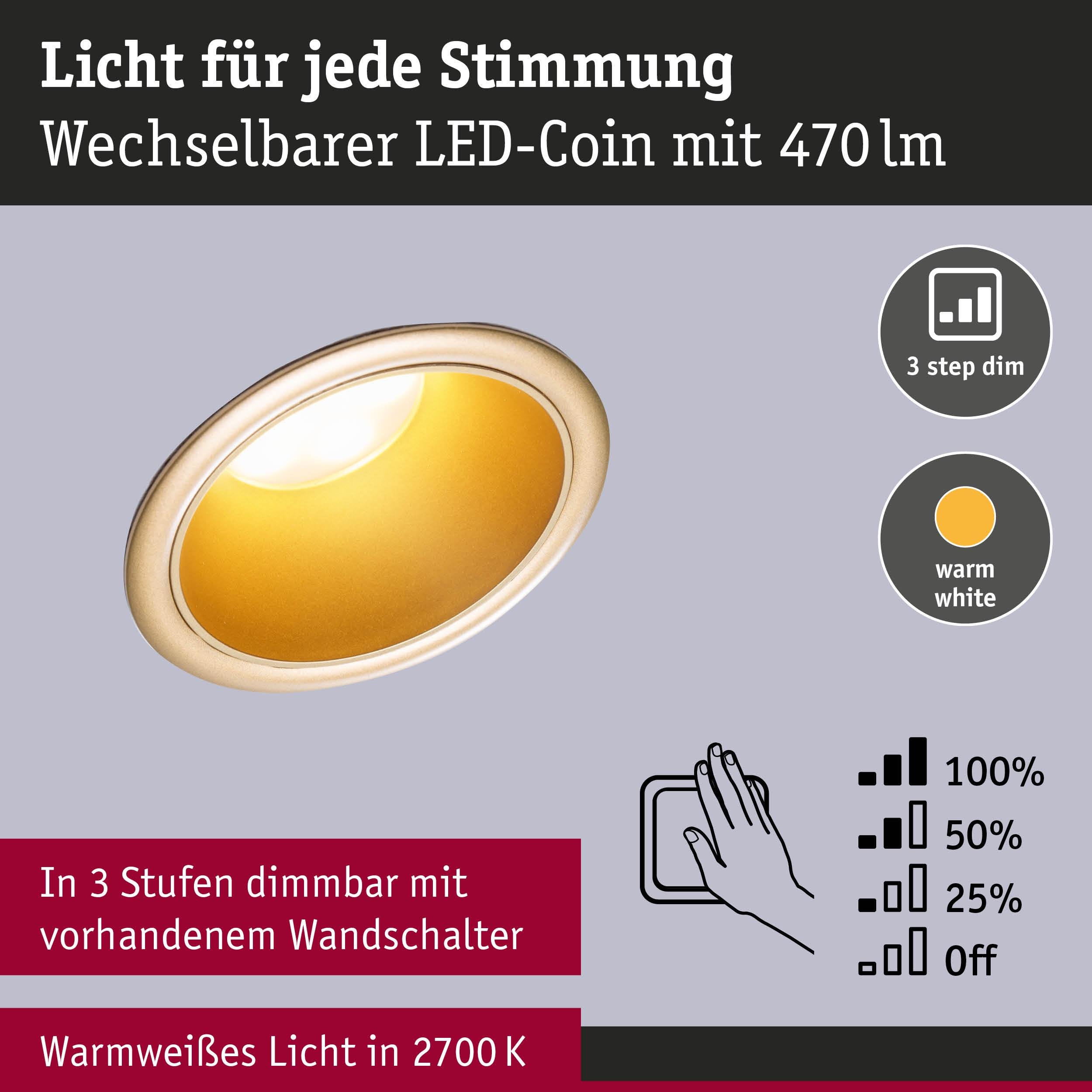 LED vestavné svítidlo 3-krokové-stmívatelné Cole Coin 6ks sada IP44 kruhové 88mm Coin 6x6W 230V stmívatelné 2700K zlatá mat - PAULMANN