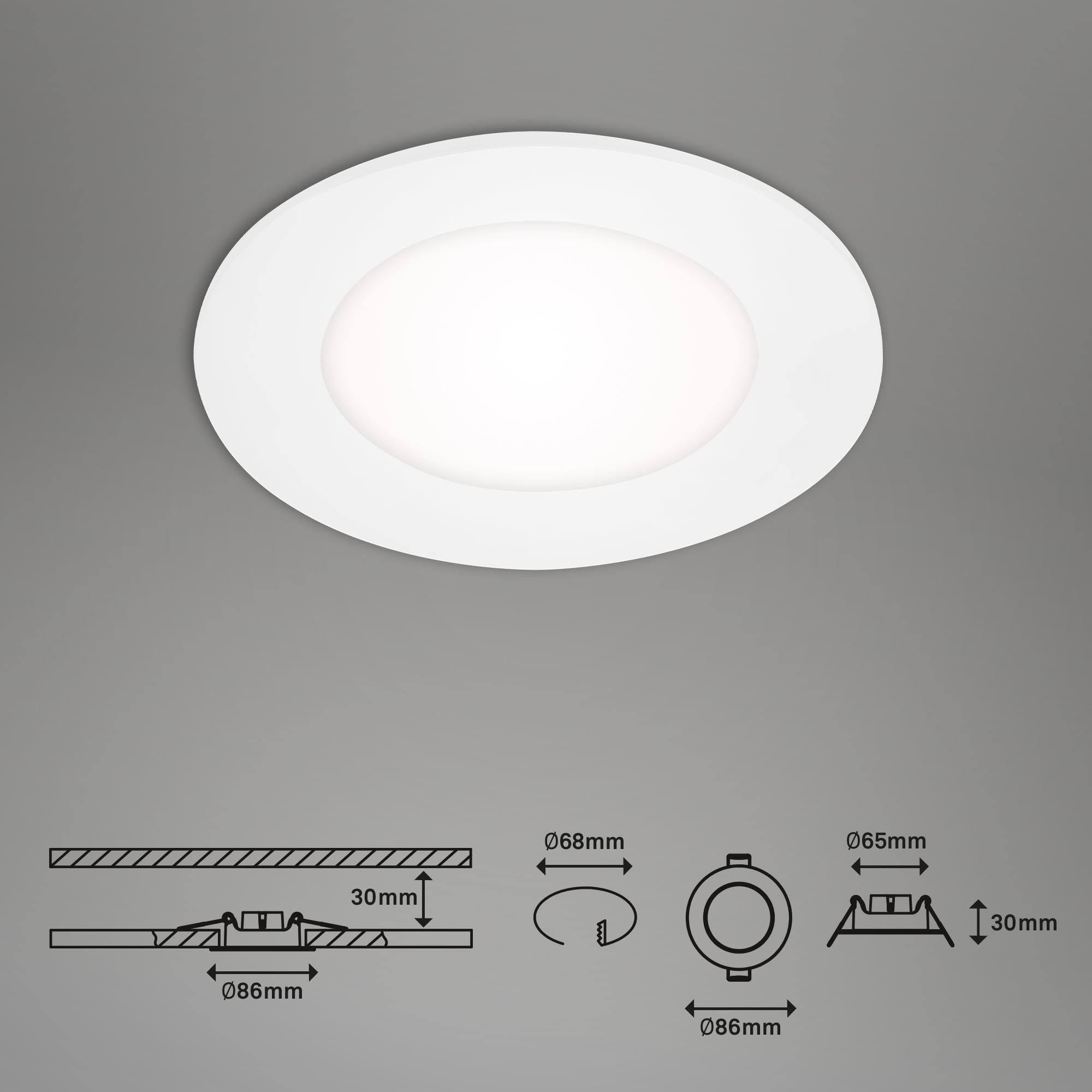 - Snadná montáž: zápustná hloubka pouze 30 mm, montážní otvor 68 mm – zvládnete ji rychle a bez kompromisů.