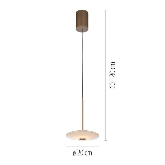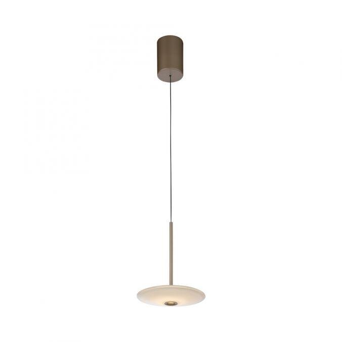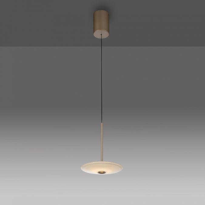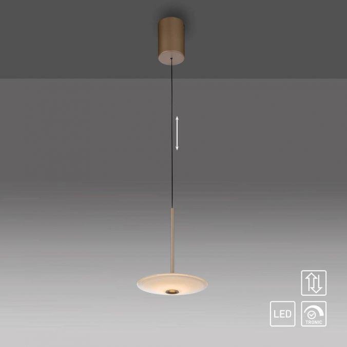 Svítidlo je navrženo v elegantním eliptickém tvaru s dominantním prvkem z opálového skla, které zajišťuje jemnou difuzi světla. Povrchová úprava v bronzové barvě podtrhuje moderní, ale zároveň nadčasový charakter. Výškové nastavení pomocí manuálního systému Comfort-Lift umožňuje flexibilní přizpůsobení svítidla konkrétním potřebám prostoru.