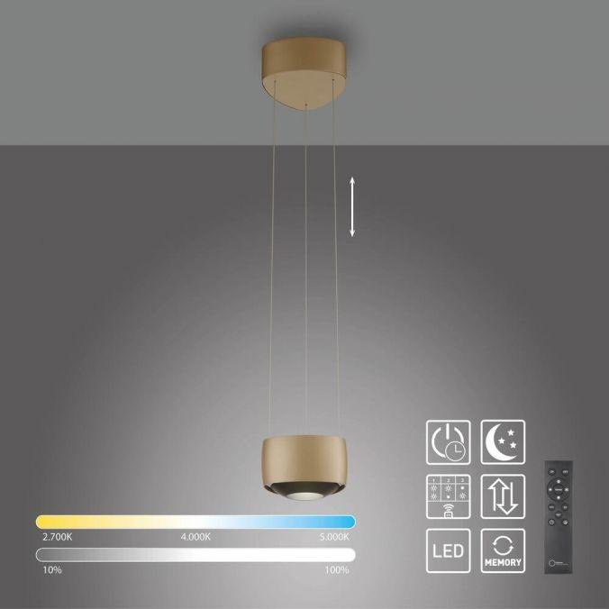 Svítidlo poskytuje přímé i nepřímé světlo díky dvěma samostatně ovladatelným LED modulům. Uživatel může volit mezi nasvícením pracovní plochy, vytvořením ambientního světla v místnosti nebo kombinací obou režimů. Teplota chromatičnosti je plynule nastavitelná od teplé bílé (2200 K) po studenou bílou (5000 K), což umožňuje měnit světelnou atmosféru od relaxační až po aktivizující. Světelný tok 950 lm je vhodný pro zónové nebo doplňkové osvětlení, například nad jídelní stůl, pracovní plochu nebo do obytných částí s požadavkem na variabilitu světla.