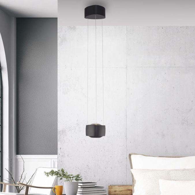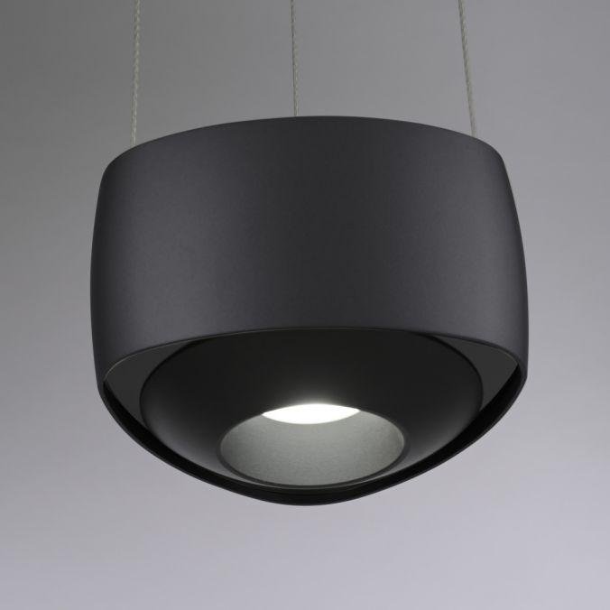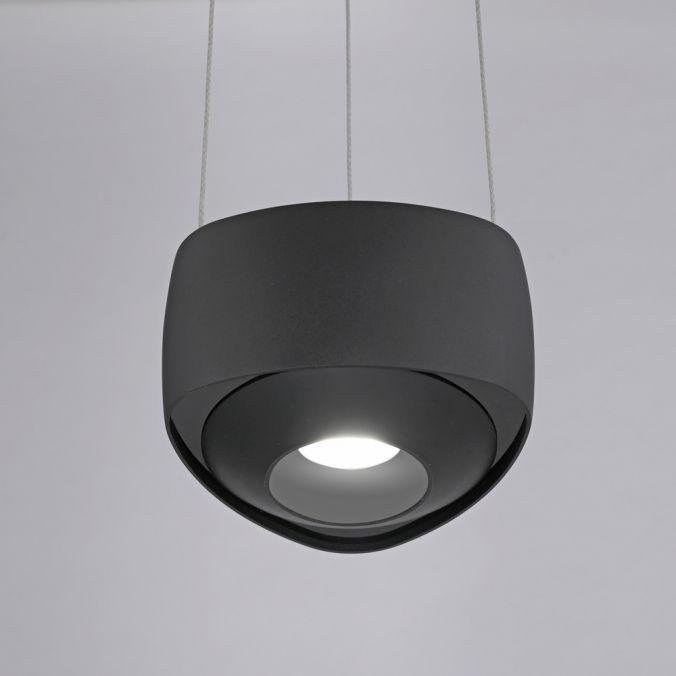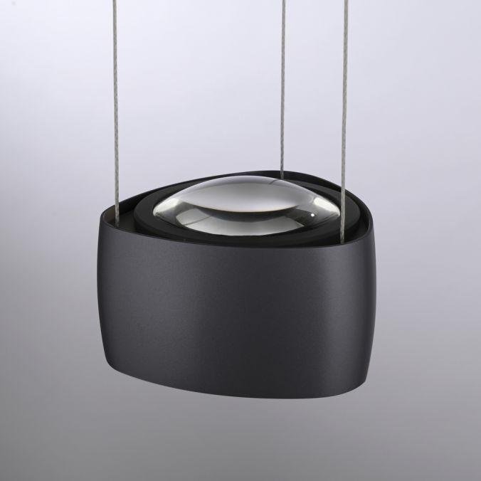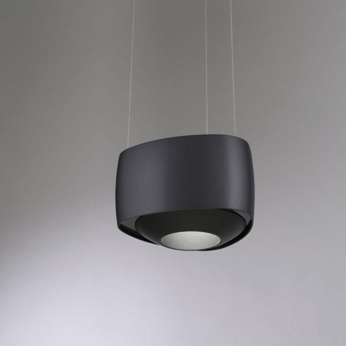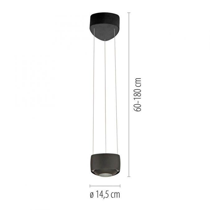 Minimalistický tvar svítidla s kompaktními rozměry (výška 1800 mm, průměr 142 mm) je tvořen hliníkovým tělem v matné černé barvě. Závěsný systém je vybaven manuálním výškovým nastavením Comfort Lift, které umožňuje přizpůsobit polohu svítidla podle výšky stolu nebo charakteru prostoru. Konstrukce je navržena s důrazem na čisté linie a technickou preciznost.
