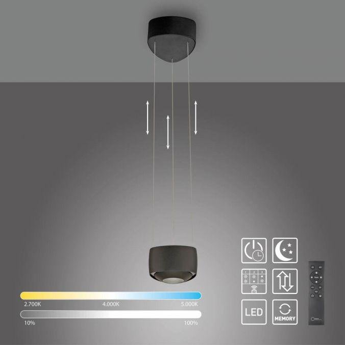 Svítidlo poskytuje přímé i nepřímé světlo – horní a dolní LED moduly lze ovládat nezávisle. Uživatel může volit mezi přímým osvětlením pracovní plochy, nepřímým nasvícením stropu pro zvýšení prostorového komfortu nebo kombinací obou režimů. Teplota chromatičnosti je plynule nastavitelná od teplé (2200 K) po studenou bílou (5000 K), což umožňuje přizpůsobit světlo aktuální denní době nebo požadované atmosféře. Světelný tok svítidla 900 lm je vhodný pro zónové nasvícení jídelních stolů, pracovních koutů nebo menších jednacích prostor. Plynulé stmívání a paměťová funkce podporují komfortní světelné scény. ZigBee umožňuje integraci do chytrých systémů řízení osvětlení.
