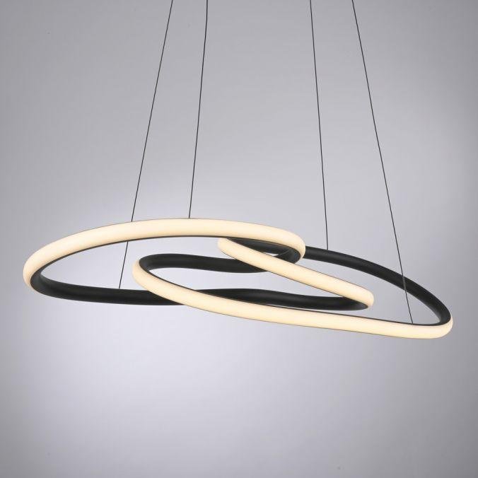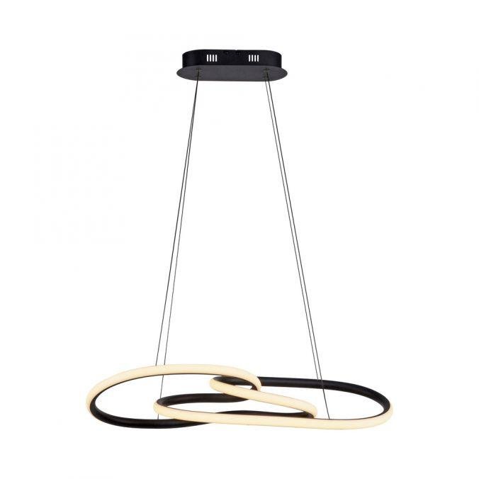 Svítidlo je tvořeno elegantně tvarovaným hliníkovým profilem v černém provedení, který vytváří dynamický, plastický dojem v prostoru. Závěsný systém umožňuje přesné nastavení výšky podle potřeb konkrétní instalace. Konstrukce je navržena pro vizuální lehkost i stabilitu.