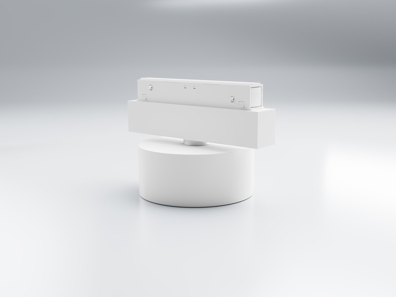 Tělo svítidla je vyrobeno z hliníku v bílé barvě (RAL 9016) s opálovým difuzorem z PMMA. Kruhový tvar a kompaktní rozměry (průměr 90 mm, výška 38 mm) umožňují nenápadné začlenění do lištového systému, přičemž svítidlo působí čistě a technicky.