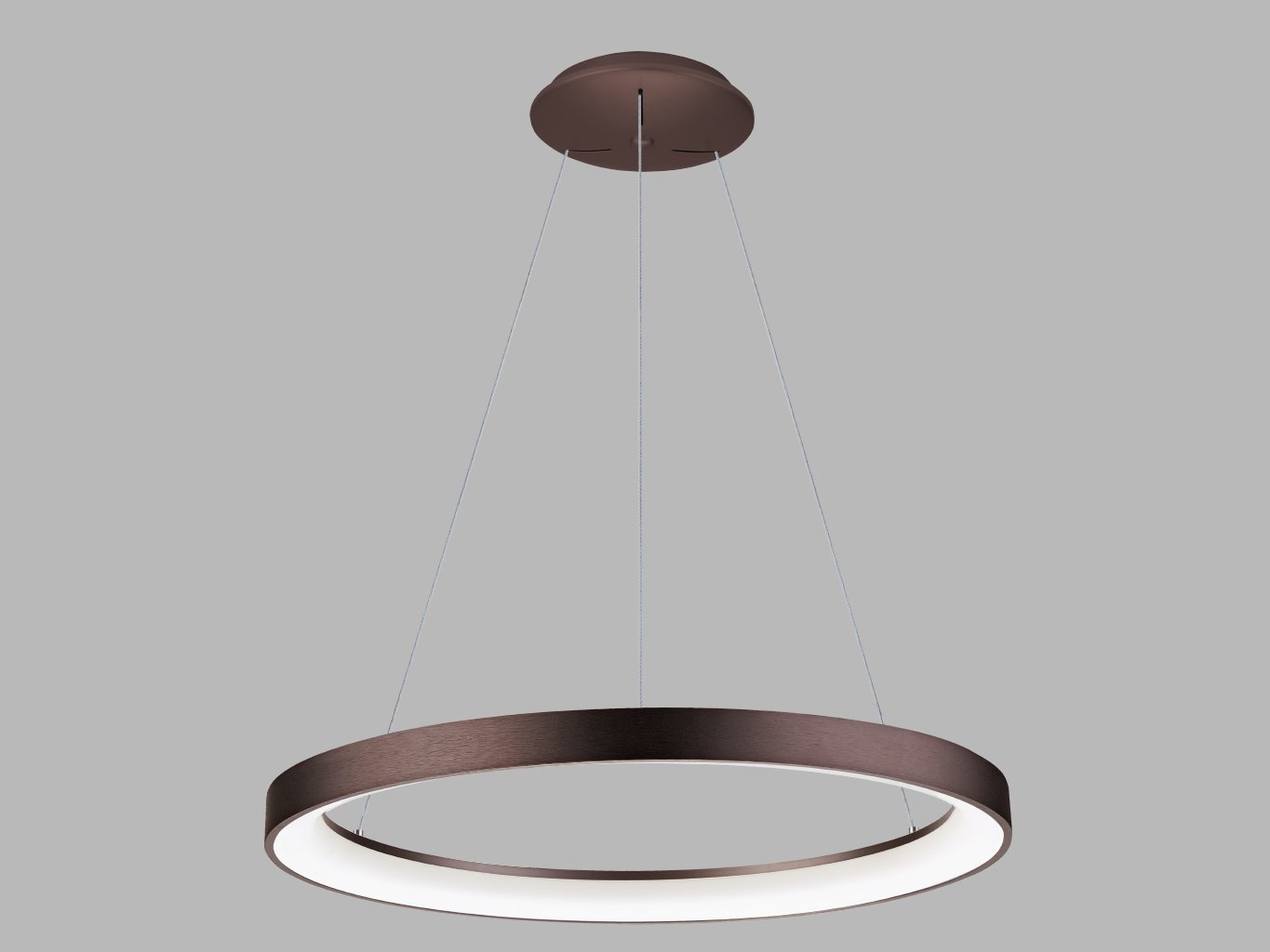 Svítidlo má výrazný kruhový tvar s průměrem 780 mm a výškou 60 mm. Konstrukce je z hliníku v kávové barvě (RAL 8025), což podtrhuje elegantní a současně decentní vzhled. Difuzor z opálového PMMA zajišťuje rovnoměrné rozptýlení světla bez viditelných bodů LED. Zavěšení je řešeno lankovým systémem s možností nastavení délky až do 2500 mm.