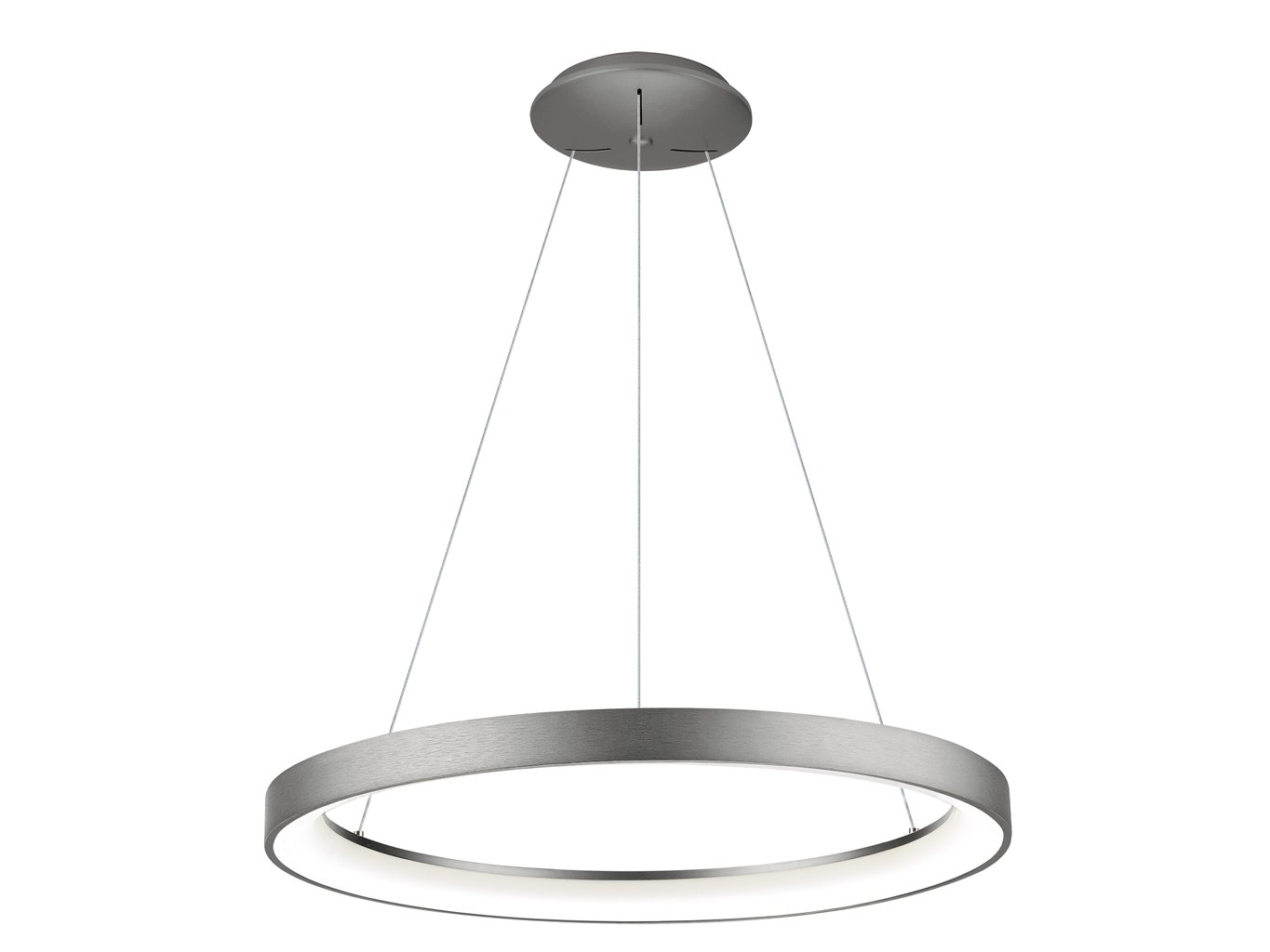 Minimalistický kruhový tvar s průměrem 780 mm a výškou 60 mm je tvořen hliníkovým profilem v matném niklovém provedení (RAL 7032). Světelný difuzor z opálového PMMA zajišťuje jemné rozptýlení světla bez oslnění. Závěsný systém umožňuje instalaci do různých výšek až do 2500 mm.