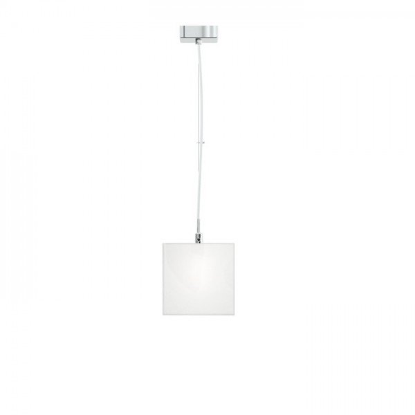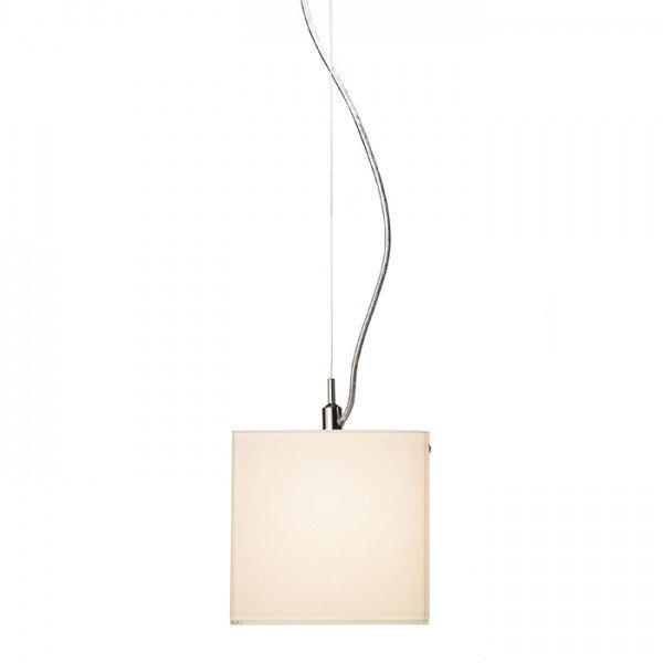 Závěsné svítidlo s kubickým stínidlem ze satinovaného skla. Stropní základna s doplňky jsou pochromované.